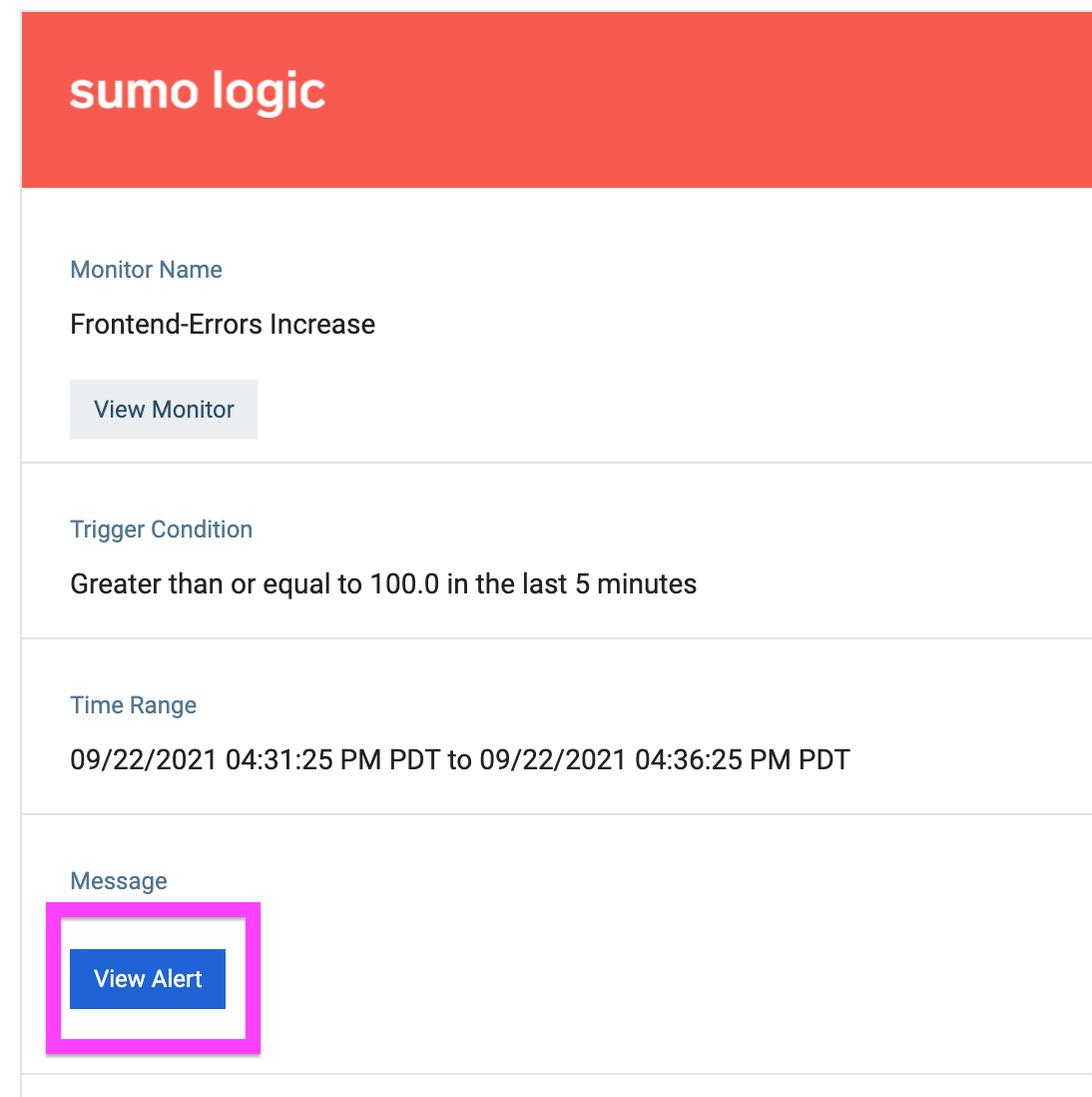 We again start the journey with an alert that informs the on-call engineer about the high error rate on the website. The alert will contain a link to the Alert page within Sumo Logic.