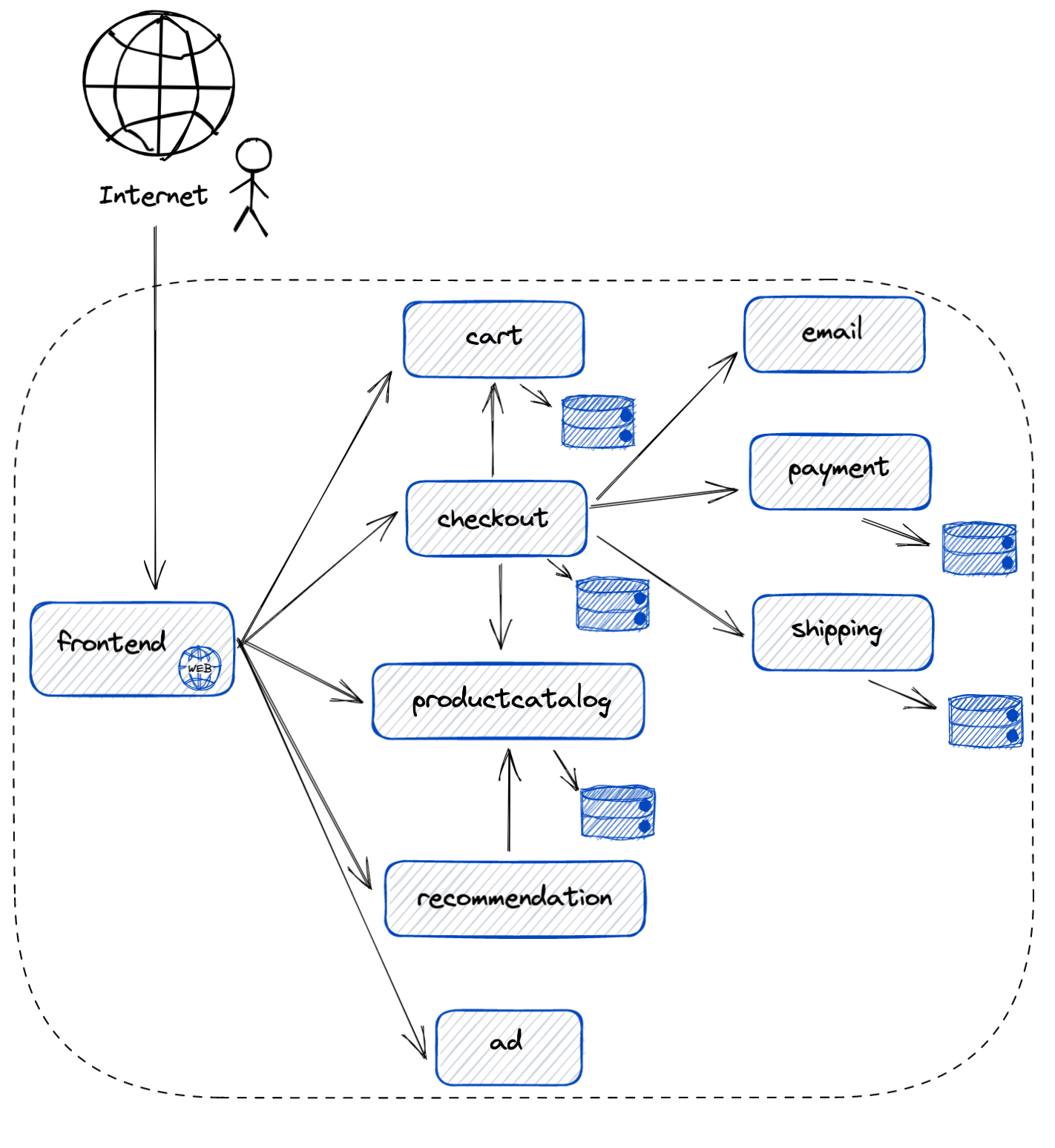 Let’s see how Alert Response, can help improve the troubleshooting experience described above, with an example. In this example, we will walk through an outage scenario on an online boutique store that sells vintage collectible items. There is something wrong with the website, and as a result, customers are experiencing errors when trying to shop. A high-level overview of the application is provided below