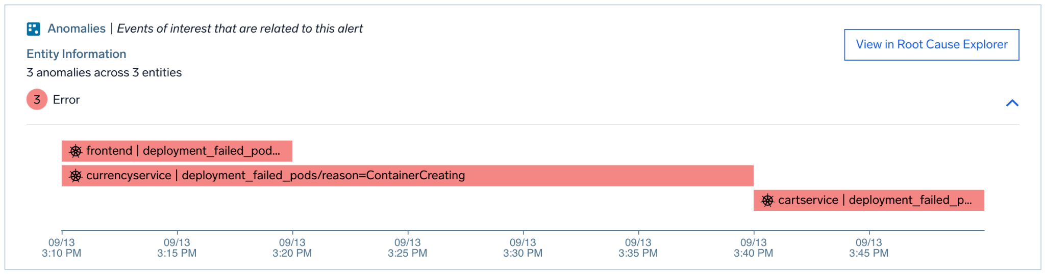 Finally, we have the Anomaly card, which as the name suggests, finds anomalies in metrics data over time on various entities that our analytics tell us are, most likely related to the alert.
