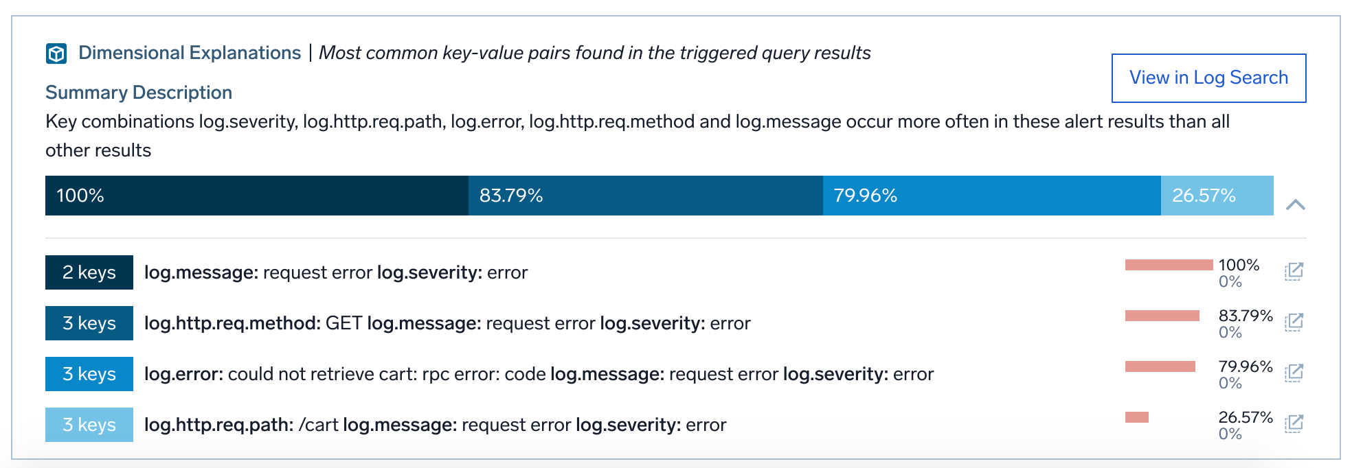 This card analyzes log data and surfaces dimensions/key-value pairs that might help explain the alert. In our case, the card is showing that ~80% of the alert logs have field log.Error =“could not retrieve cart: rpc error: code”, signifying that something is wrong with the cart service. It also provides drill-down links to view the log messages and get more details.