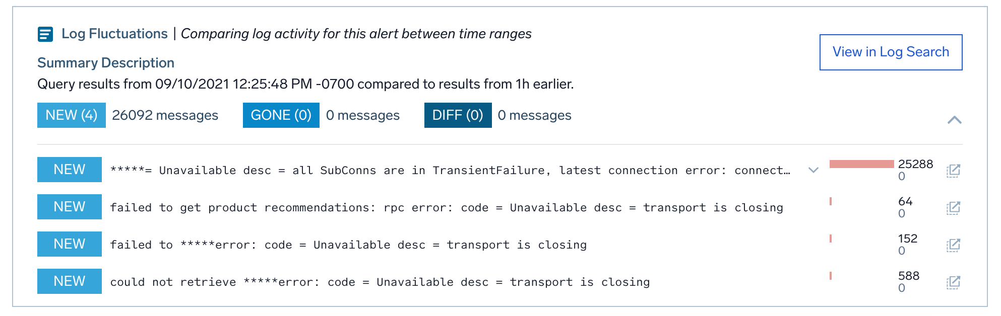 In our example, the card has identified a connection failure error signature. These failures all started happening after the alert(252800 log messages match the signature compared to 0 before the alert). Here again, we have drill-down links for further investigation.