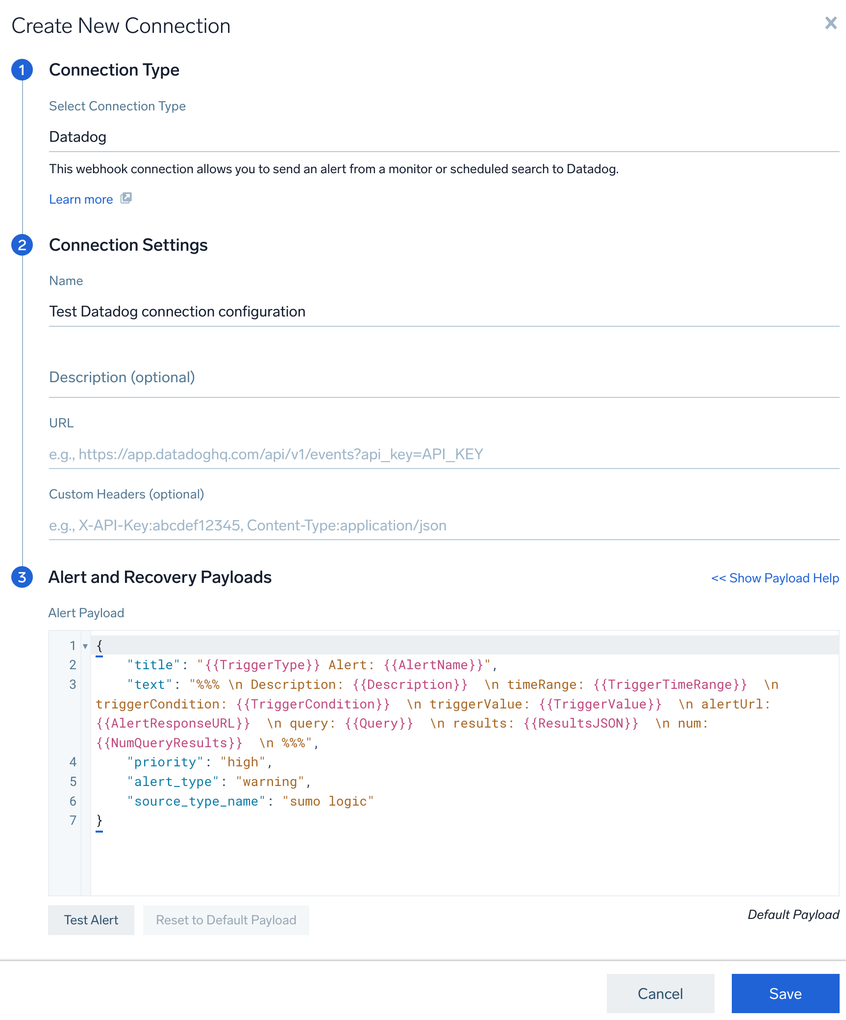 Once you set up a webhook connection, you can send a Sumo Logic alert to your Datadog account. For information on how to build your webhook payload refer to Datadog webhooks in their API Help.