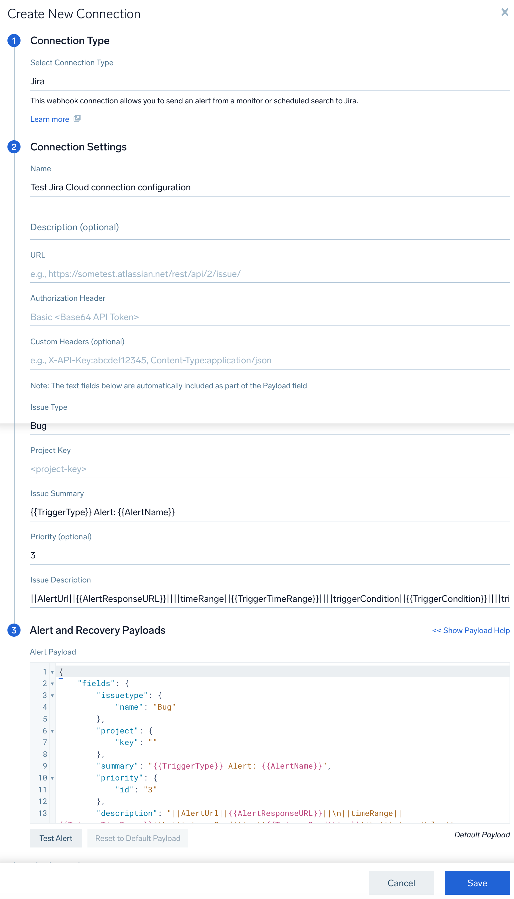 } - To test the connection, click Test Alert. If successful, you'll see a