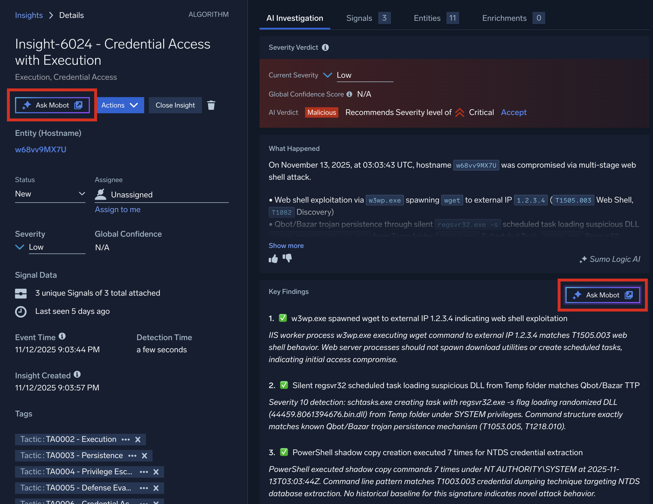 - From the insight's details page, click Ask Mobot to open the AI investigation in Sumo Logic Mobot.