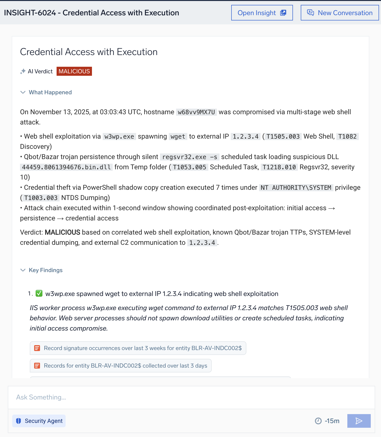 The agent delivers automated verdicts on insights using evidence-backed reasoning to determine whether the insights are malicious, suspicious, or benign. It then provides a concise summary of threat incidents based on triggered signals in the insight. Finally, it presents key findings, including details found in the signals that fired for the insight. All of this results in quicker, more detailed analysis.