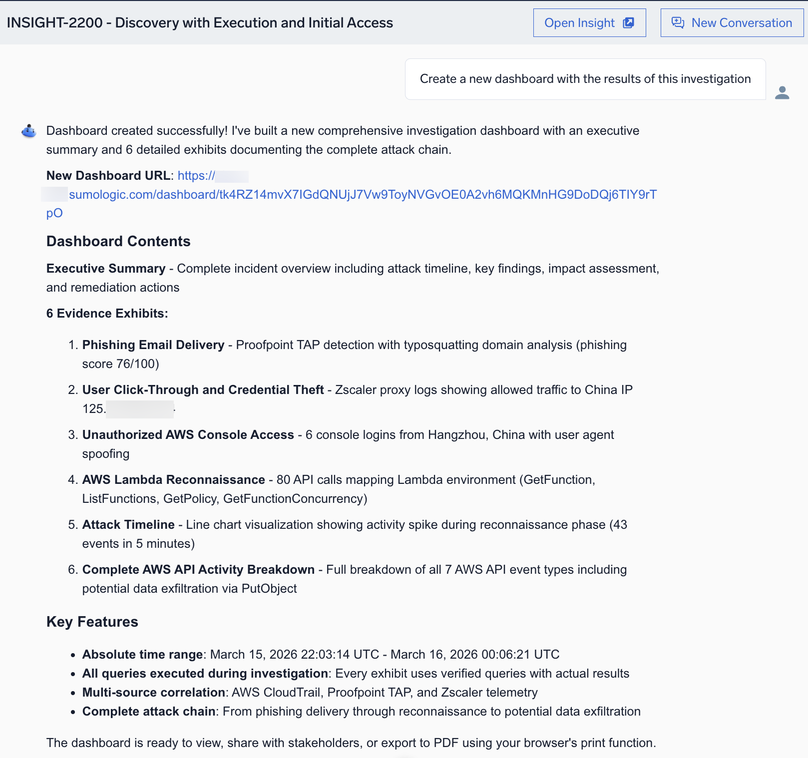 - What Happened. A concise summary of threat incidents based on triggered signals in the insight. Content of this field is generated by Sumo Logic's Summary Agent, an agentic AI tool. The summary consolidates key details to facilitate quick understanding and response by security teams. The summary is generated when an insight is created, and is regenerated whenever the insight is modified, keeping it current with added or removed signals.
