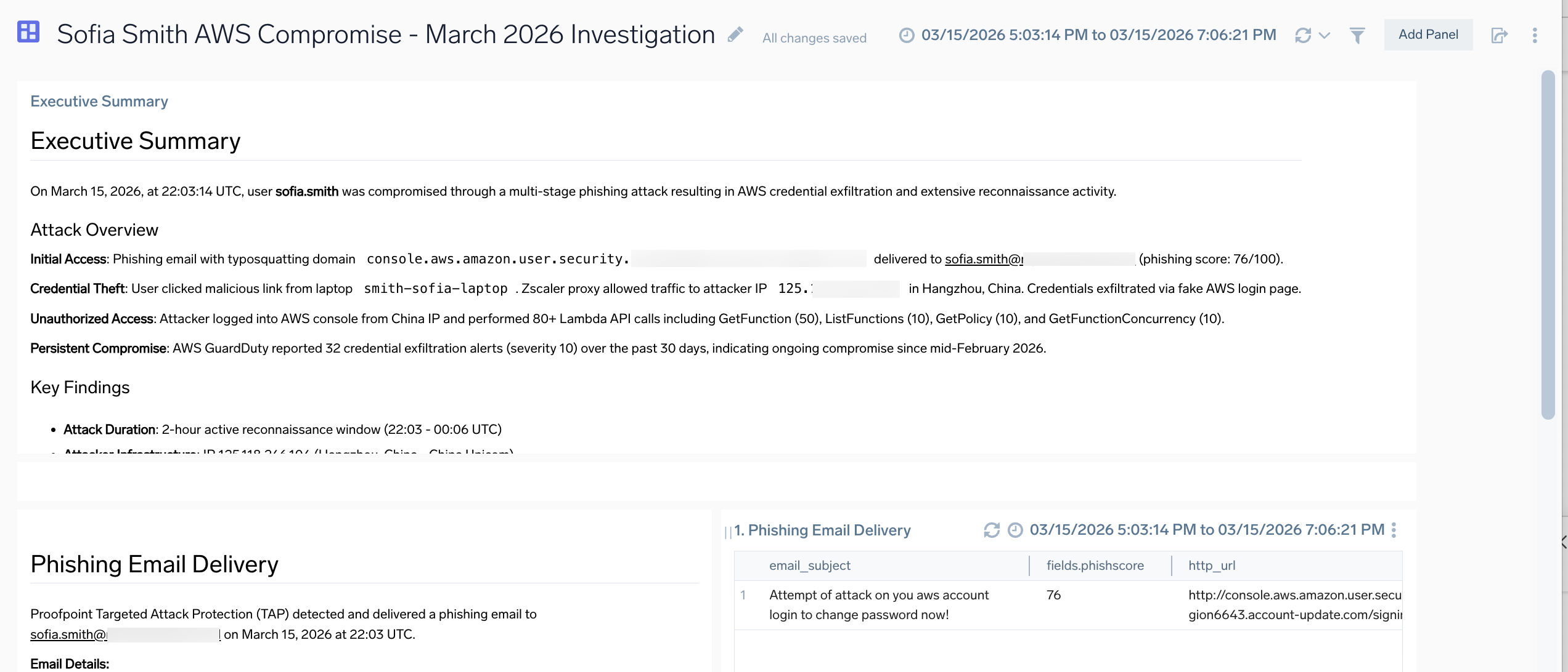 To generate dashboards based on the context of your investigation, simply ask Mobot. For example, in the Ask Something... field you could type Create a dashboard with the results of this investigation. The agent will build the dashboard: