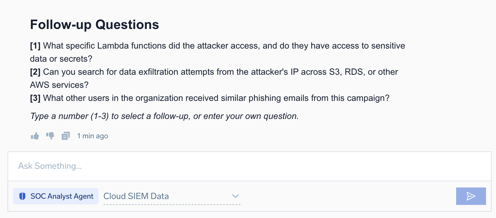 - As you work with the investigation agent, after each step you will be presented with follow-up questions. Type a number corresponding to a follow-up question, or enter your own question.