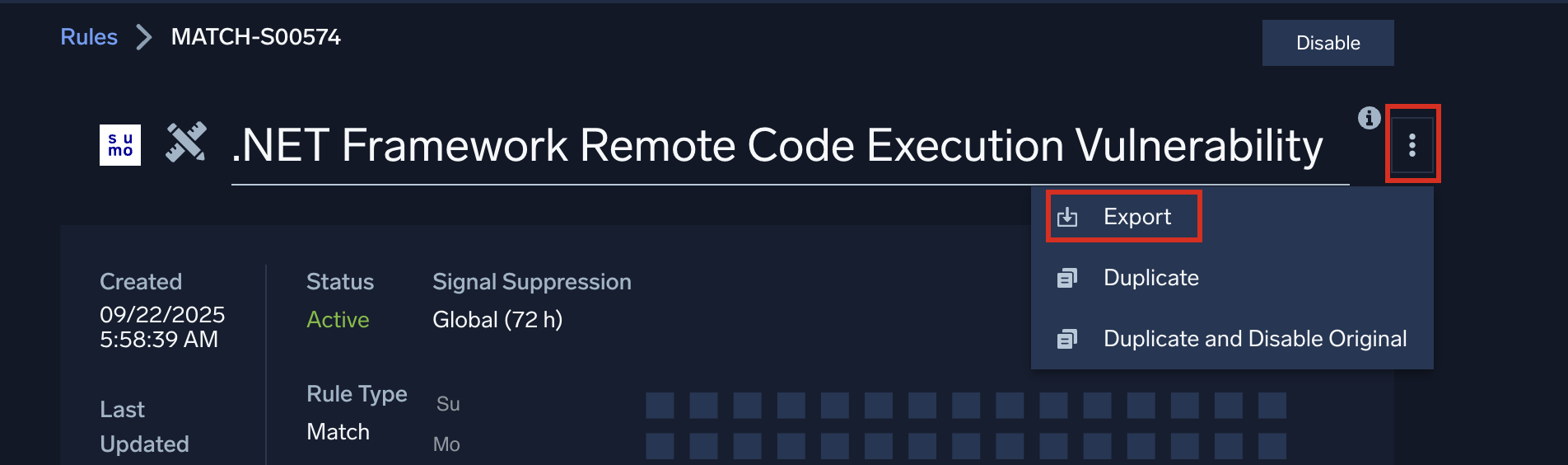 - Click the three-dot kebab icon to the right of the rule name and select Export from the menu.