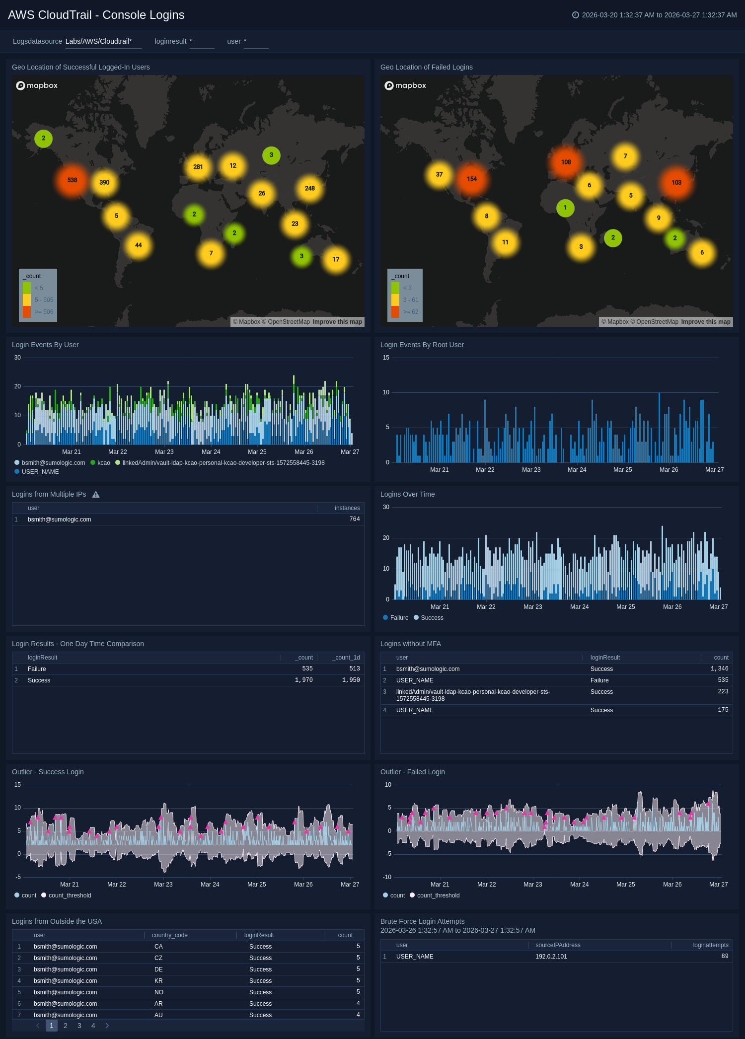 See information about CloudTrail console logins, including the location of users, login events by user, logins from multiple IP addresses, logins from outside the US, and logins without multi-factor authentication.