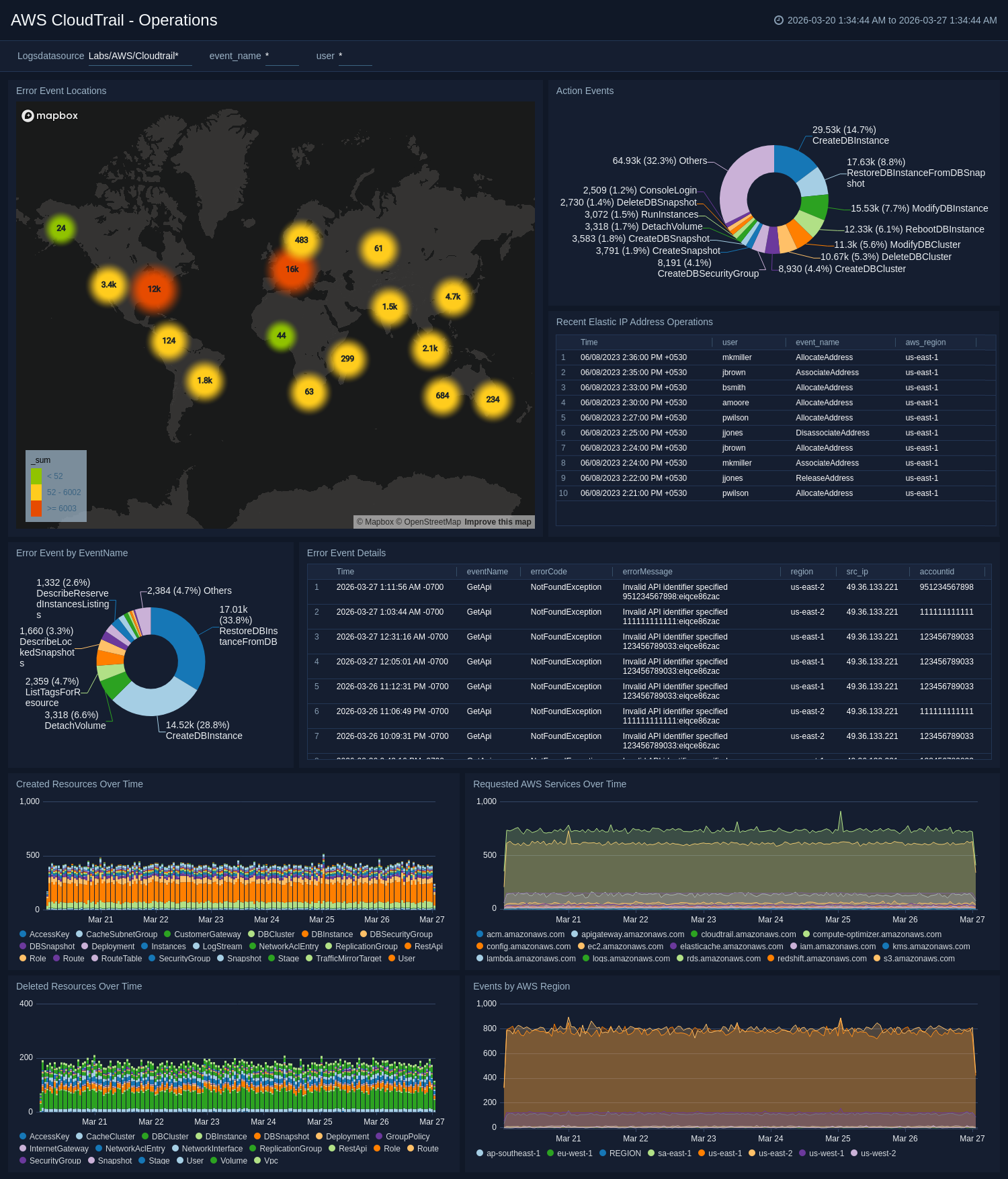 See information about operations activity in your AWS account, including action events, requested AWS services, events by AWS region, created and deleted resources, and elastic IP address operations.