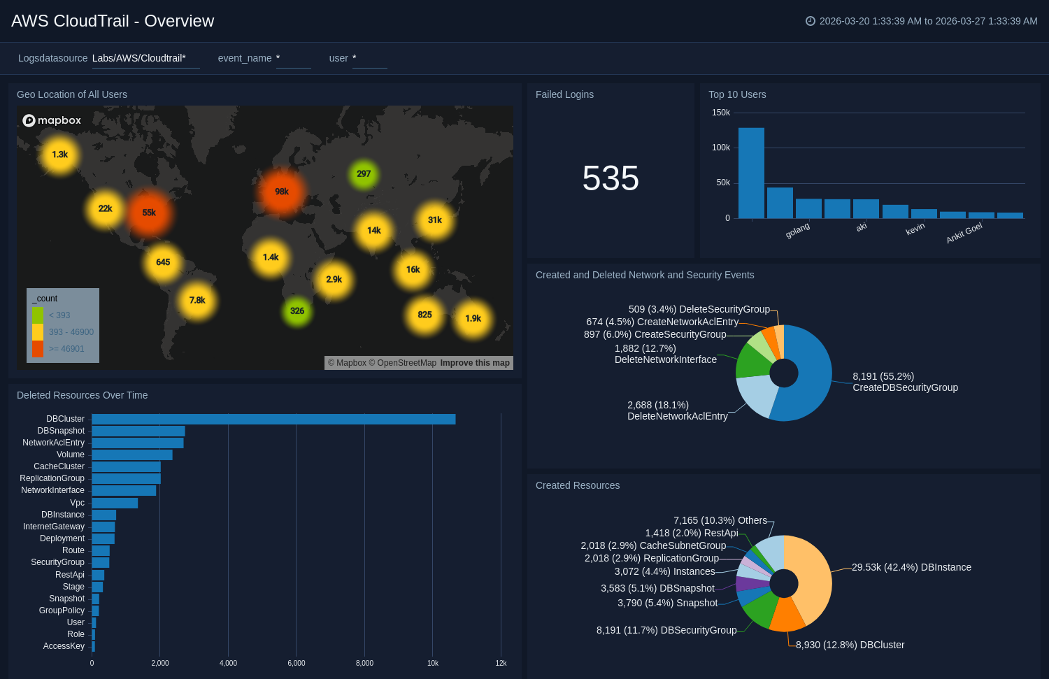 See an overview of your AWS users, resources, network, and security events. The panels present information about the top 10 users, failed logins, user locations, and resource creation and deletion.
