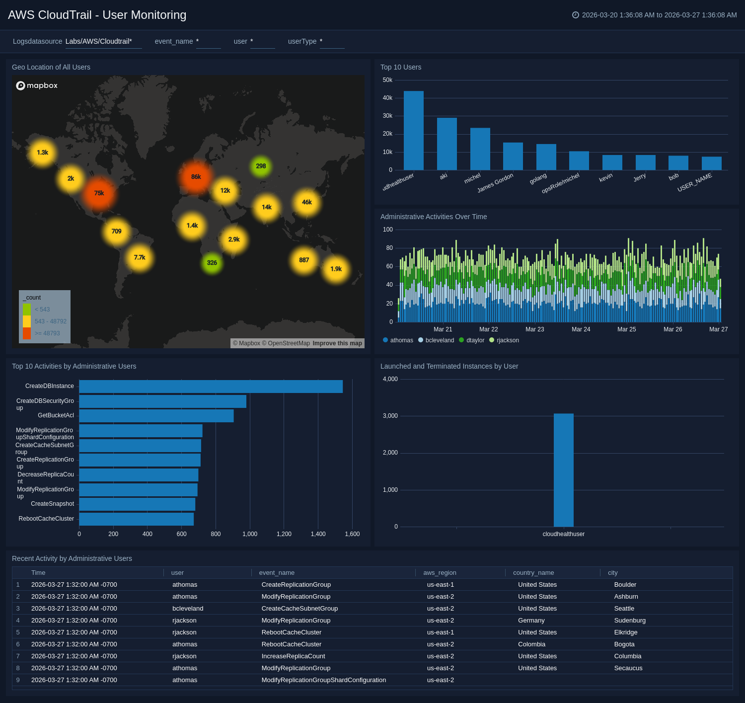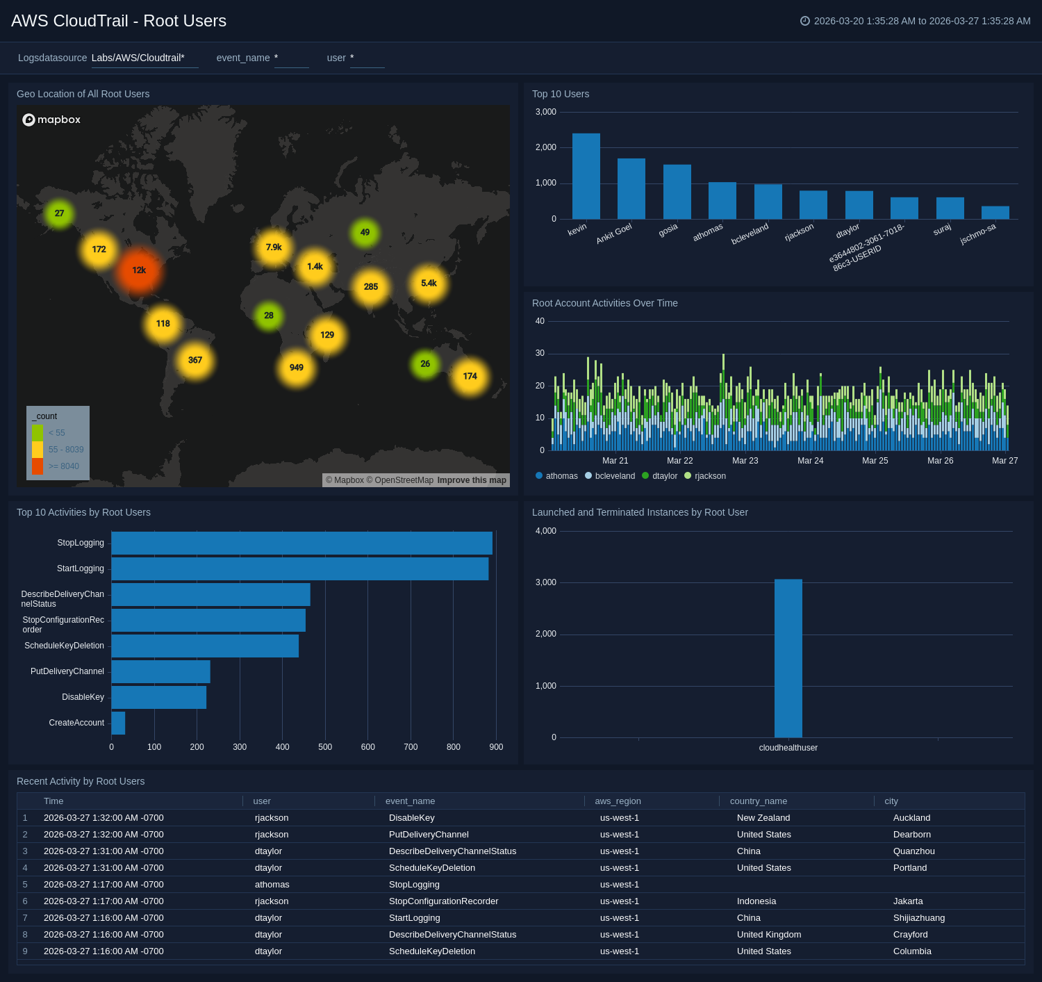 See information about root user activity in your AWS account, including root user locations, administrative activities, and instance launch and termination by root user. This dashboard has the same panels as the User Monitoring dashboard but is filtered specifically for root user activity.