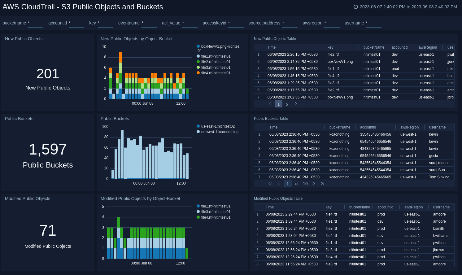 New Public Objects Table. Displays a table with new public objects in your S3 bucket, with time, key, bucket name, account ID, region, username, and access key ID for the last 24 hours.