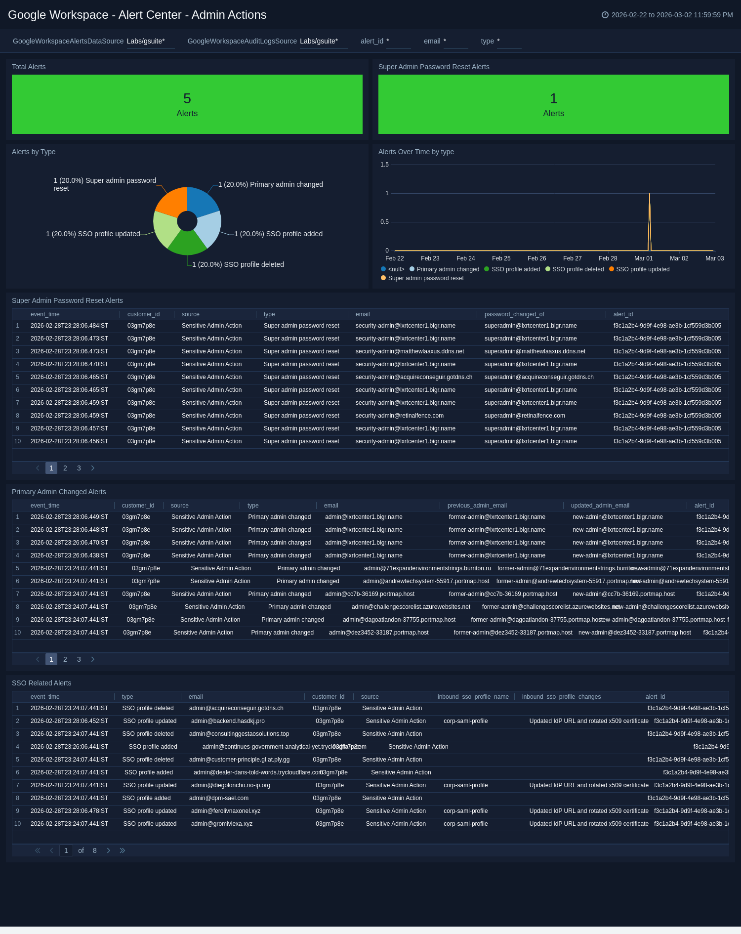 The Google Workspace - Alert Center - Admin Actions dashboard provides detailed insights into sensitive administrative actions in Google Workspace. This includes information on super admin password reset alerts, primary admin changed alerts, SSO-related alerts, total alerts, and alert trends over time by type.