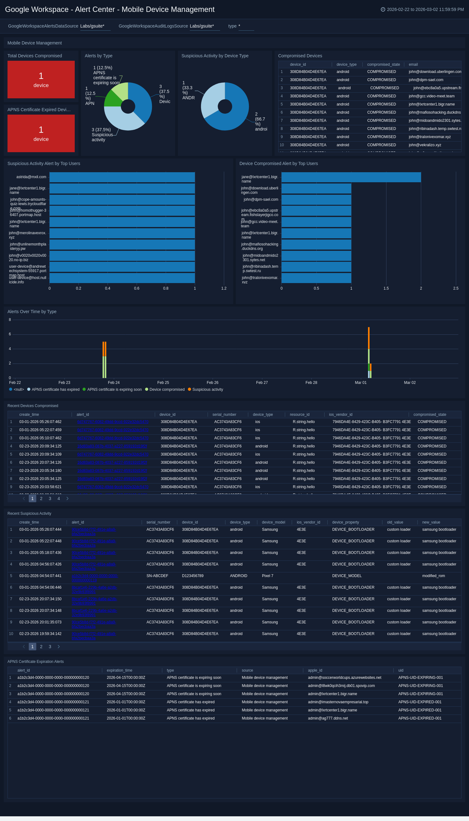 The Google Workspace - Alert Center - Mobile Device Management dashboard provides detailed information on mobile device security alerts in Google Workspace. This includes information on compromised devices, suspicious activity by device type, APNS certificate expiration alerts, device compromised alerts by top users, and recent suspicious activity.