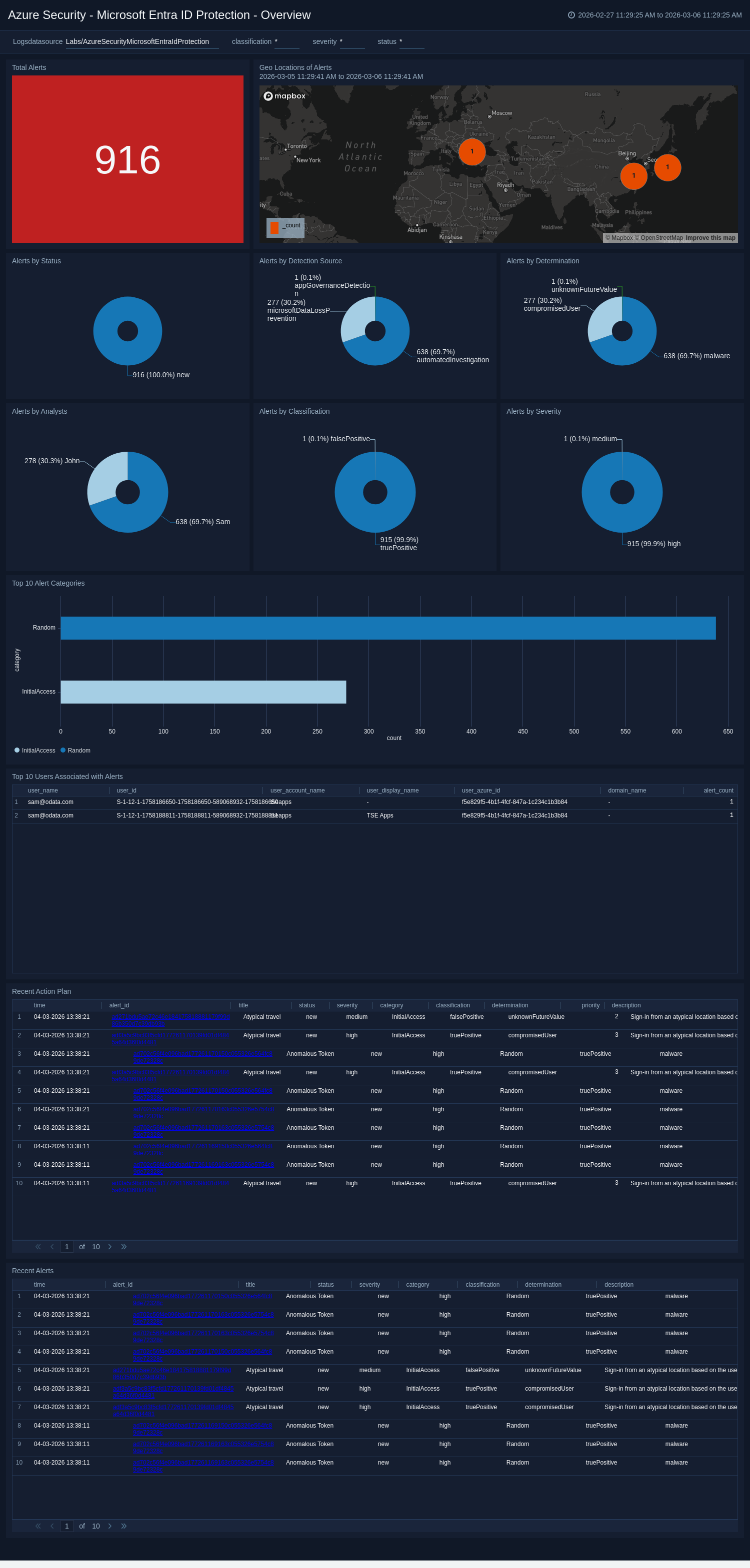 The Azure Security - Microsoft Entra ID Protection - Overview dashboard provides a comprehensive view of identity-related security risks and anomalies detected across Azure environments. It enables analysts to monitor risky sign-ins, user risk levels, and identity protection trends, ensuring timely detection and mitigation of potential account compromises.