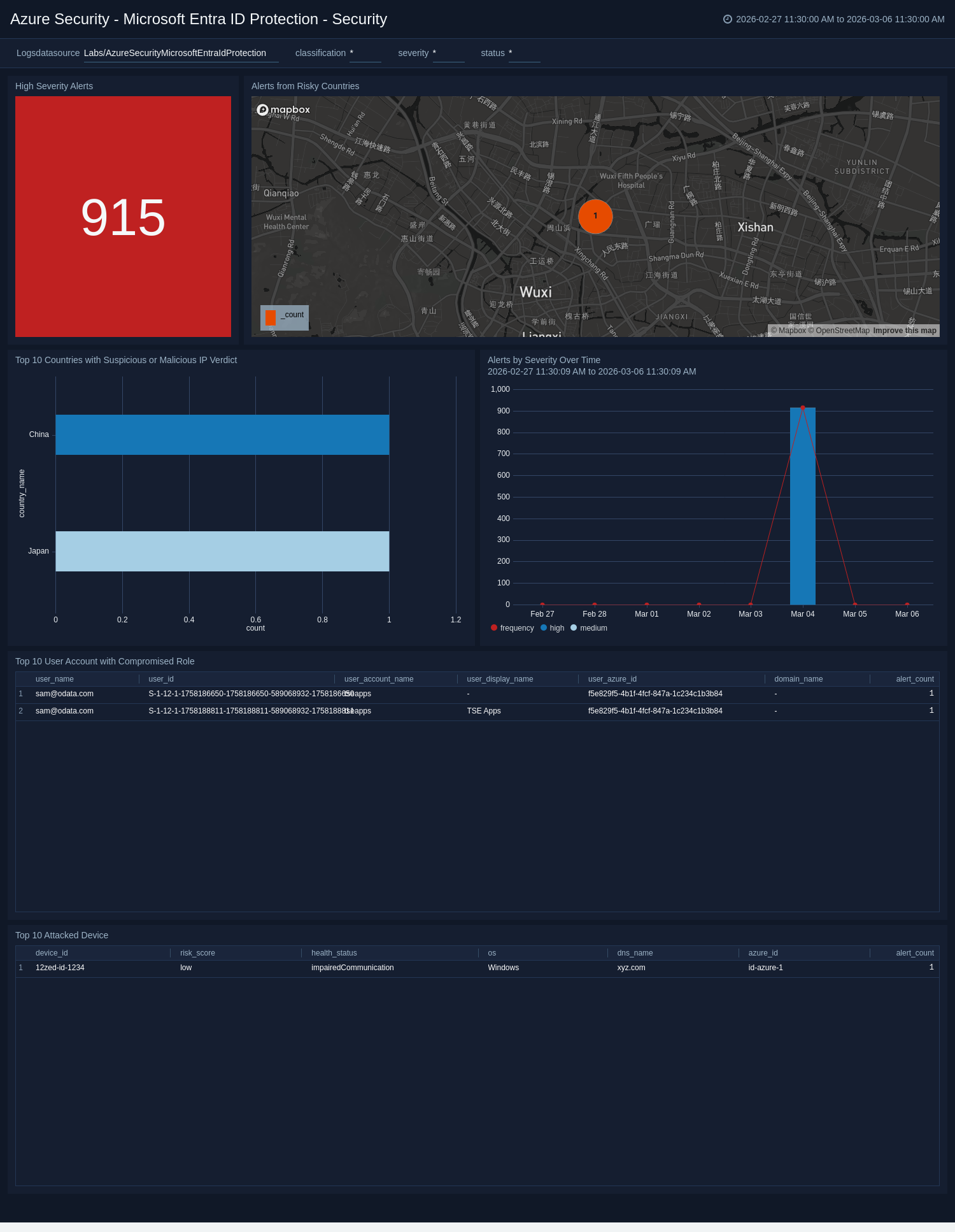Azure Security - Microsoft Entra ID Protection - Embargoed Device | This alert is triggered when a single device generates multiple alerts, indicating potentially malicious behaviour. It helps you identify high-risk devices, monitor suspicious activity more effectively, and take swift action to prevent further compromise. | Critical | Count > 5 |