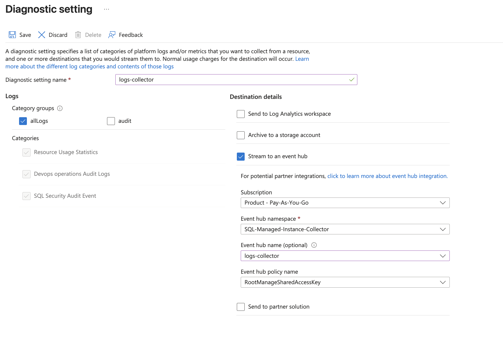 allLogs. - Use the Eventhub namespace and Eventhub name configured in previous step in destination details section. You can use the default policy