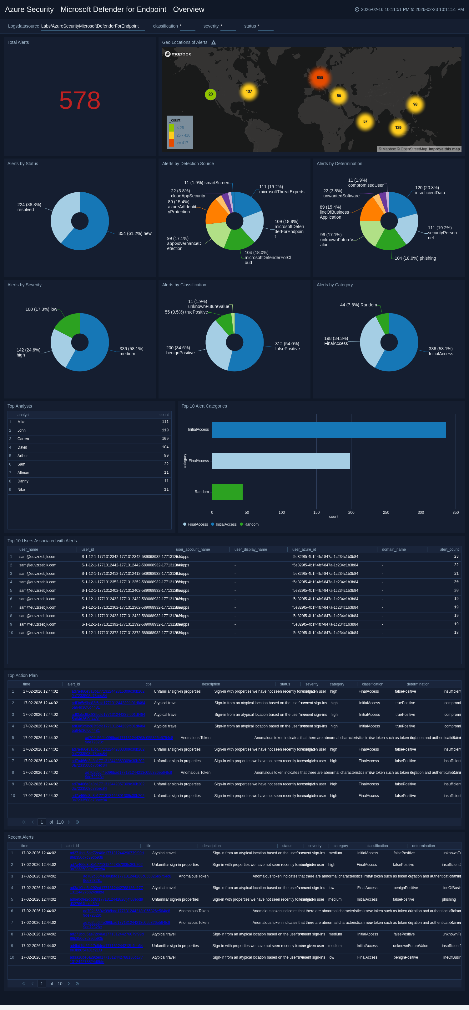 The Azure Security - Microsoft Defender for Endpoint - Overview dashboard offers a detailed view into security threats detected across endpoints, enabling analysts to assess and act swiftly on potential incidents. With a broad set of visualizations, it displays total alerts, high-severity alerts, and their distribution by status, classification, determination, service source, and detection source.