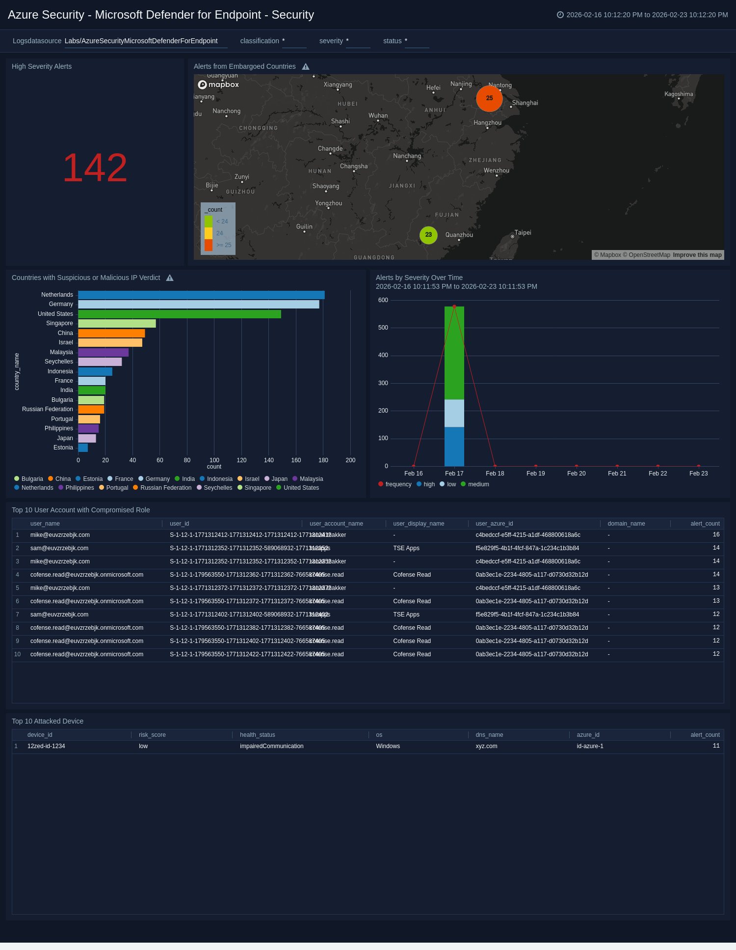 The Azure Security - Microsoft Defender for Endpoint - Security dashboard delivers a high-level view of your organization’s endpoint threat landscape, helping teams identify where risks concentrate and how they evolve over time. Visual trend panels illustrate changes in alert severity, revealing whether high-risk incidents are increasing and guiding prioritization of response efforts.