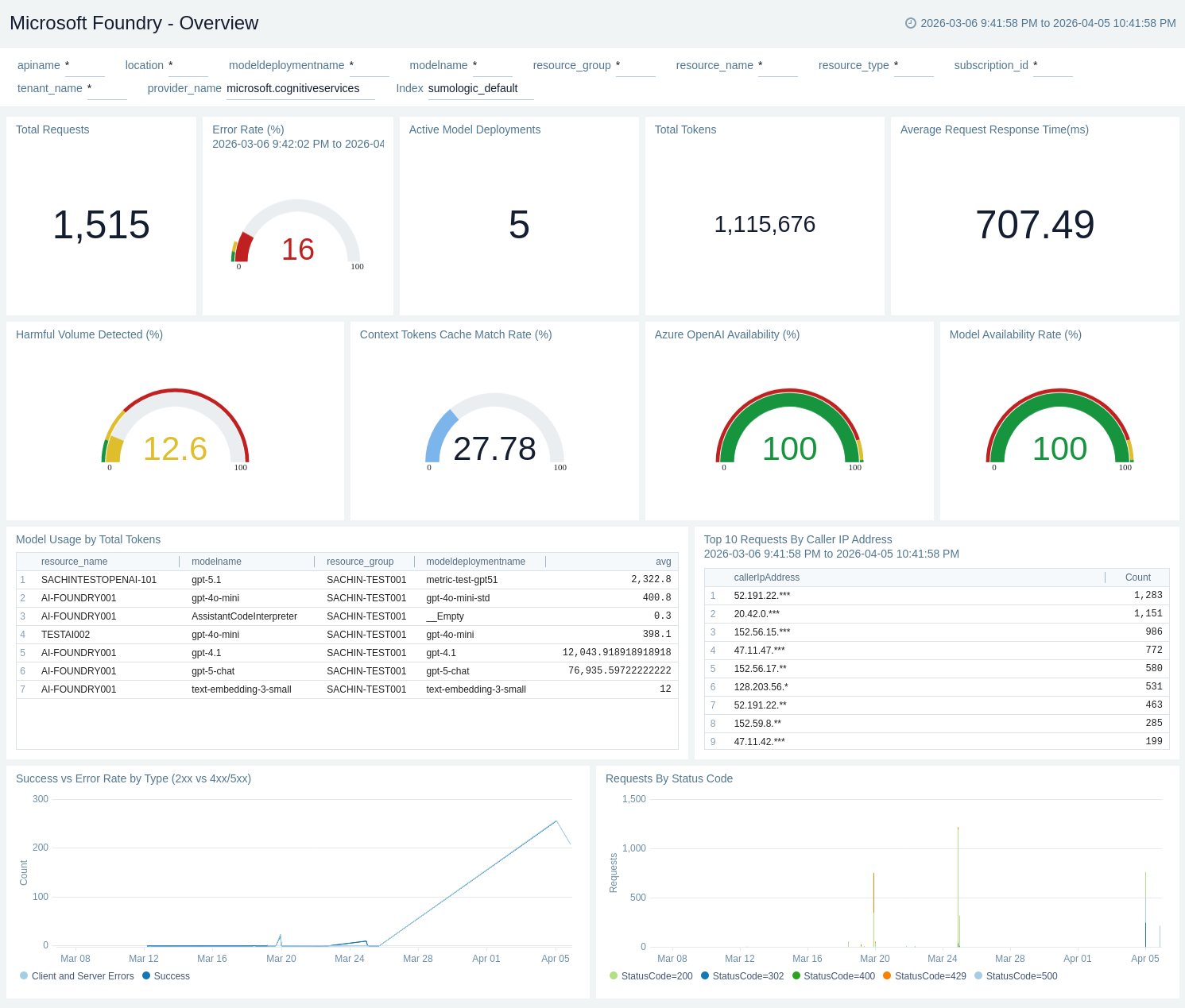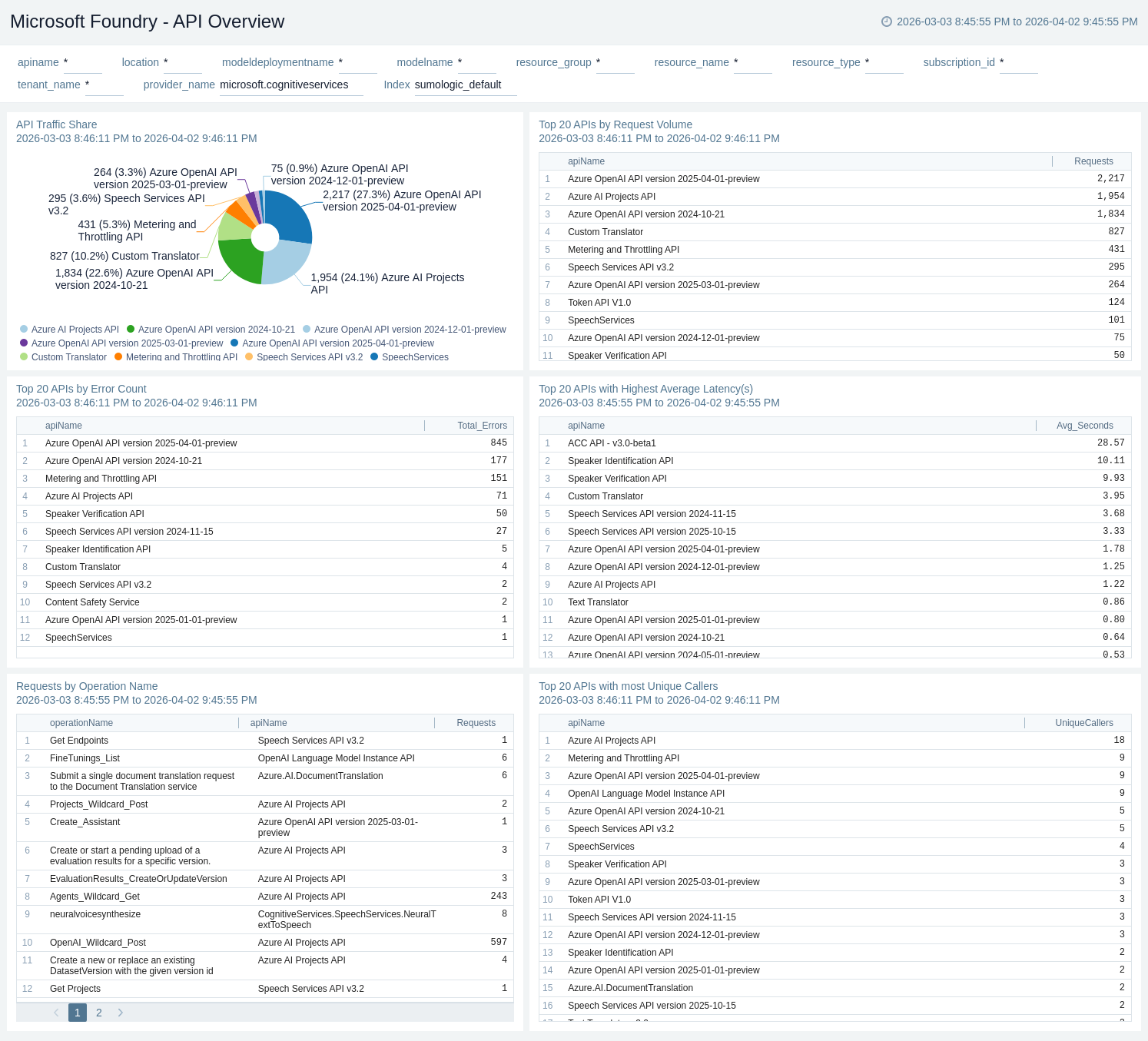 The Microsoft Foundry - API Overview dashboard provides a high-level view of the overall health, performance, usage, and safety signals of your Microsoft Foundry service. Panels display information on availability, request activity, token consumption, latency, and moderation events across deployments.