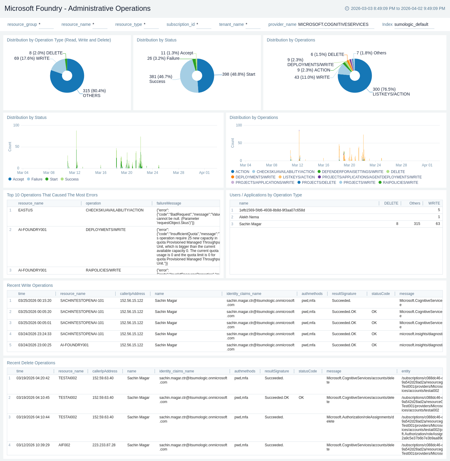 The Microsoft Foundry - Administrative Operations dashboard provides insights into the operational activities and status of your Microsoft Foundry resources. Panels display information on operation type distribution, success rates, top operations causing errors, and recent write and delete operations to maintain an audit trail of configuration changes.