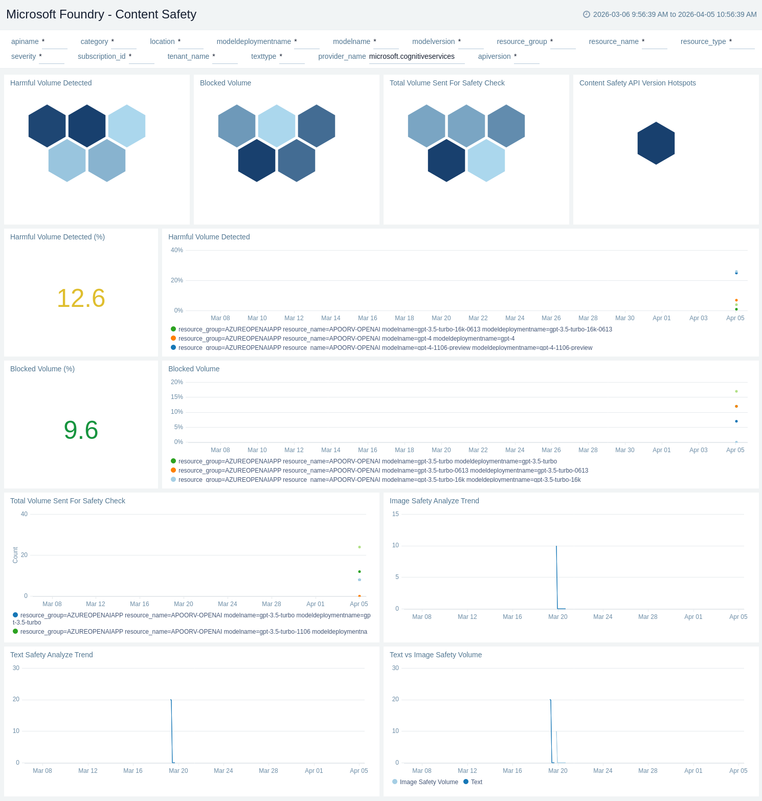 The Microsoft Foundry - Content Safety dashboard provides insights into responsible AI policies and content safety enforcement. Panels display information on harmful content detected, requests blocked by filters, abusive user identification, and system safety events.