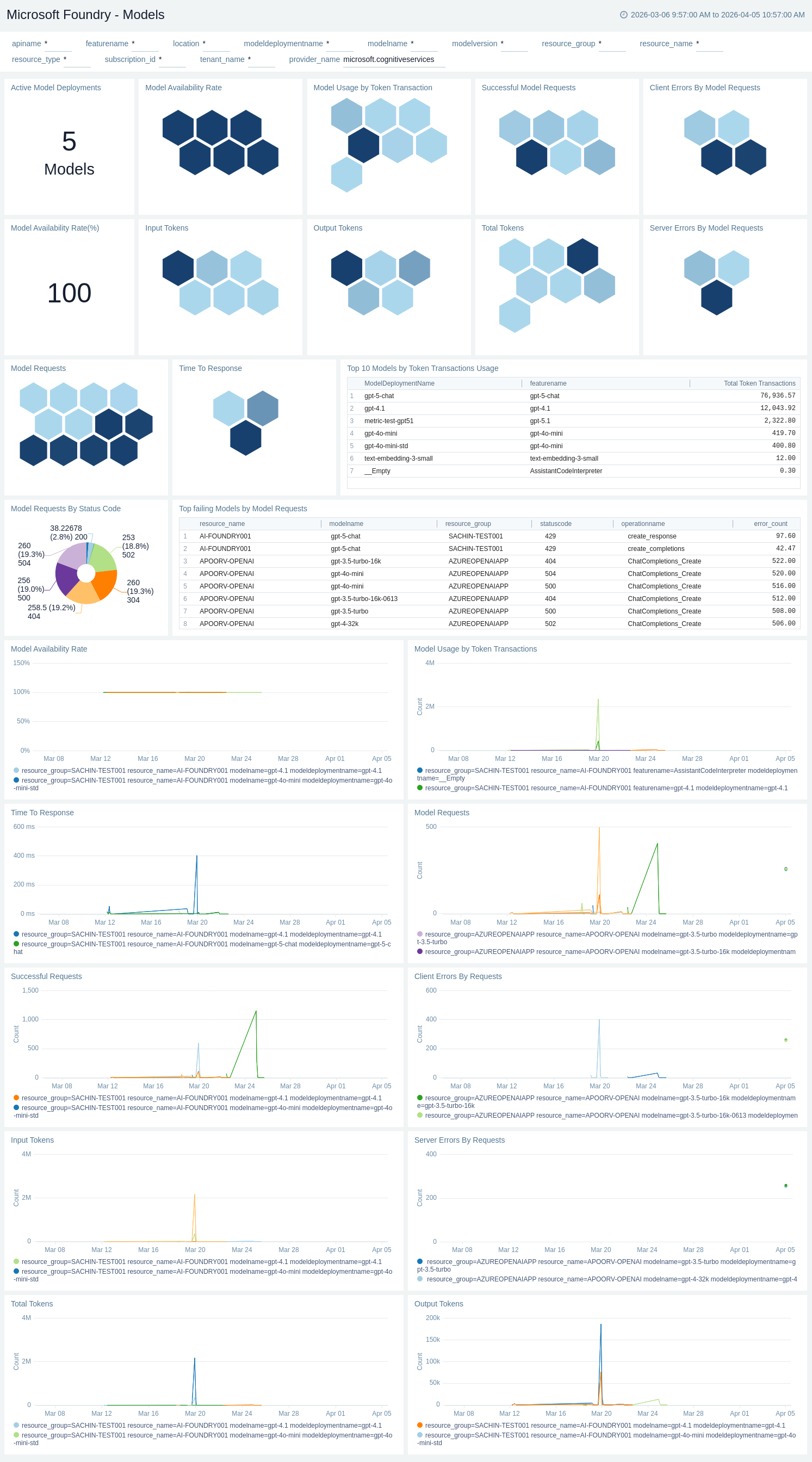 The Microsoft Foundry - Models dashboard provides a deep dive into individual model performance, usage, and health. Panels display information on model availability, request rates, operations, latency, throughput (tokens per second), and usage split by deployment, model name, and resources.