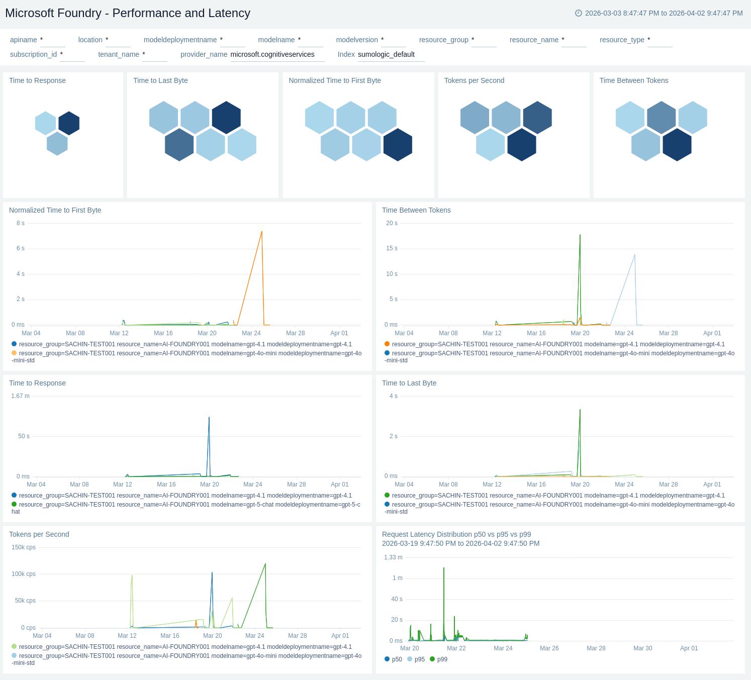 The Microsoft Foundry - Performance and Latency dashboard provides insights into the responsiveness of Microsoft Foundry APIs and models. Panels display information on time-to-first-byte (TTFB), time-to-response, time-between-tokens for streaming performance, tokens-per-second speed, and time-to-last-byte across models and deployments.