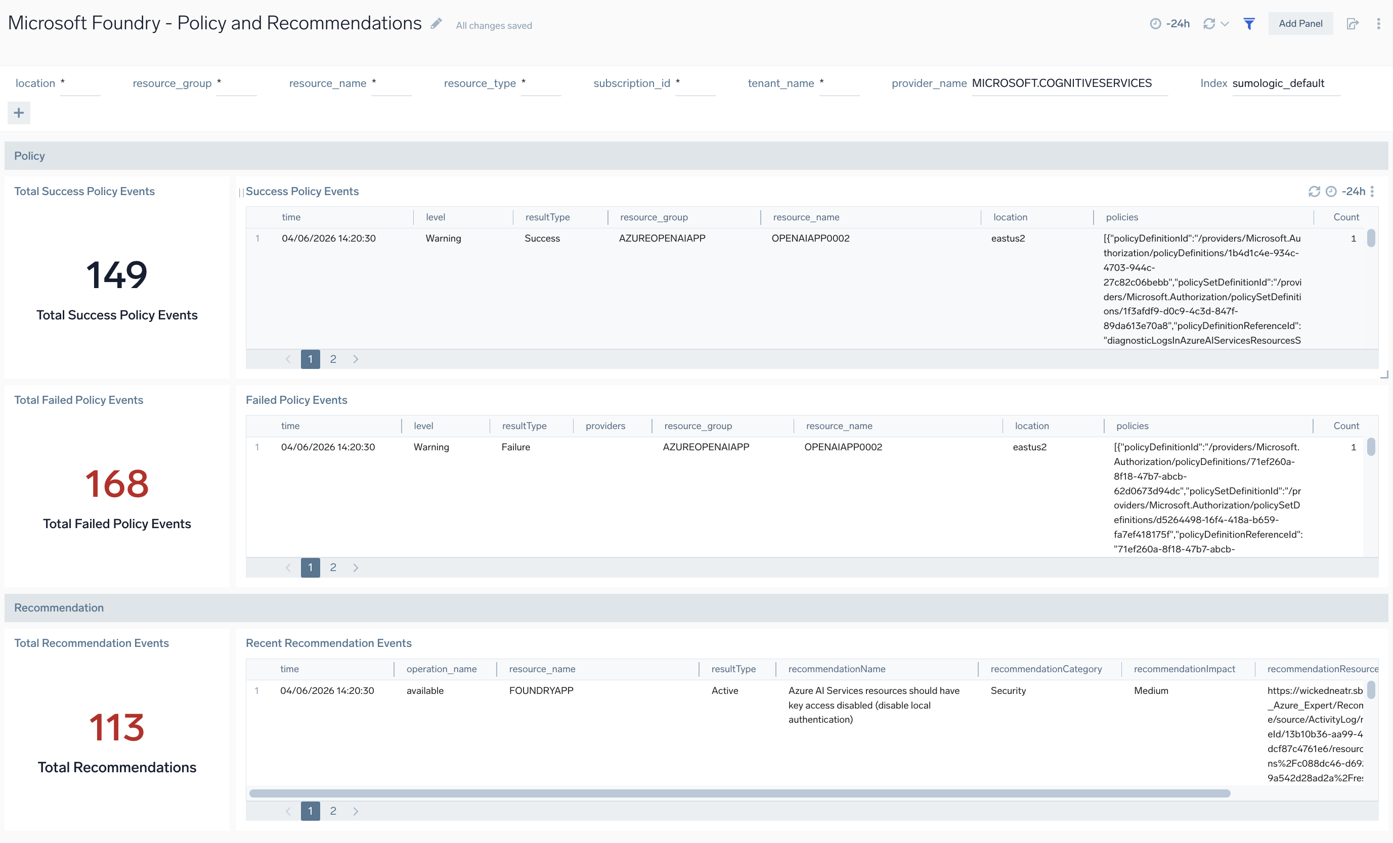 The Microsoft Foundry - Policy and Recommendations dashboard provides insights into policy events and recommendations for your Microsoft Foundry resources. Panels display information on the success and failure rates of policy events, recent recommendations to improve performance and security, and trends in policy events over time.