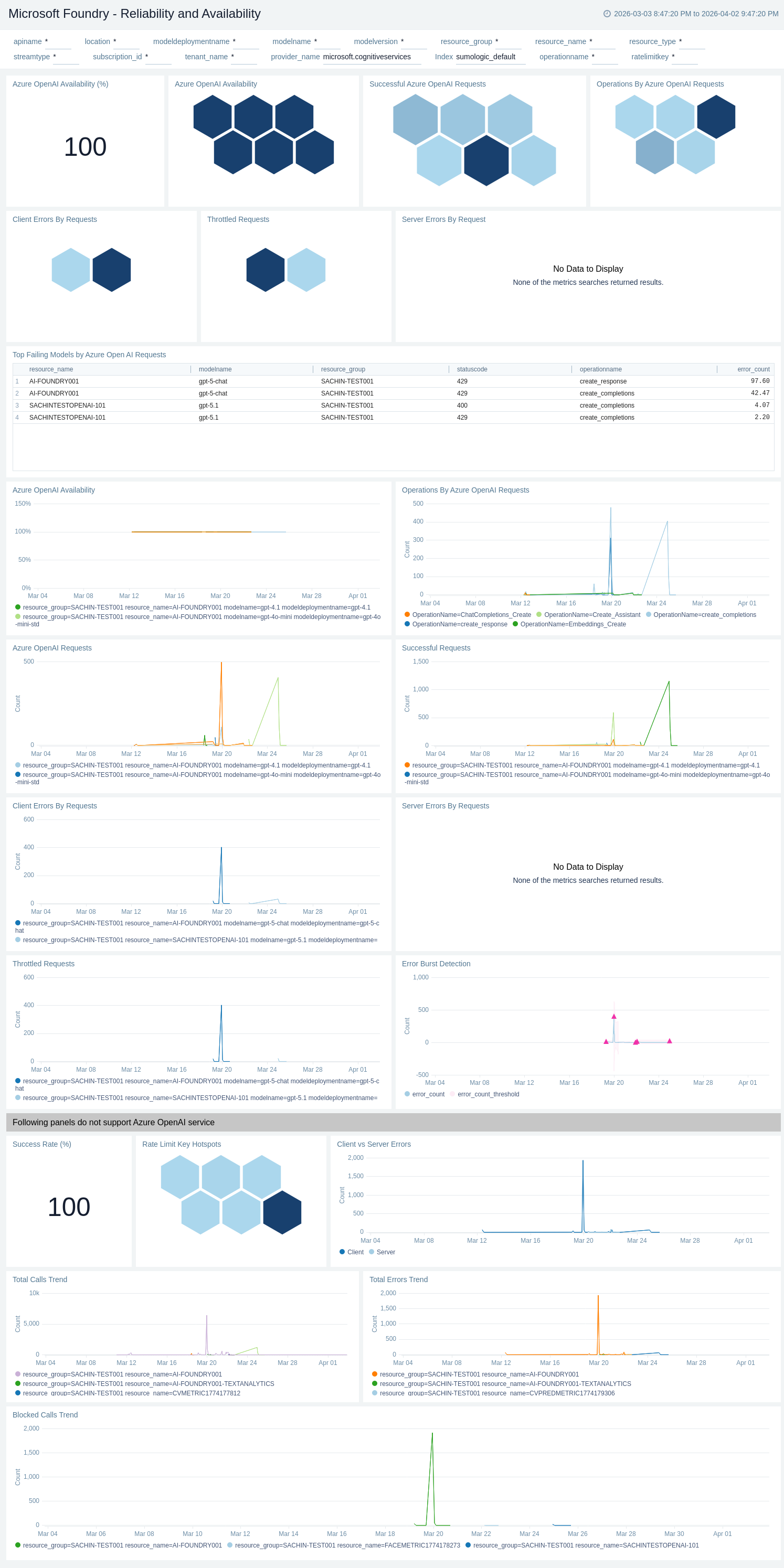 The Microsoft Foundry - Reliability and Availability dashboard provides visibility into the operational health of Microsoft Foundry across deployments and models. Panels display information on overall API availability, request success vs client/server errors, and throttled calls (429) to help identify availability degradation, error spikes, and throttling events.