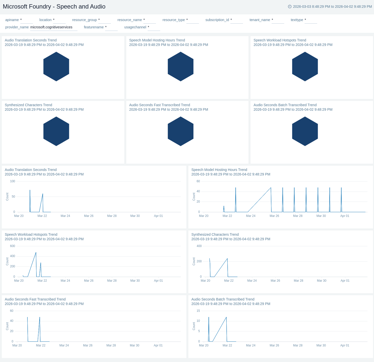 The Microsoft Foundry - Speech and Audio dashboard provides insights into speech processing and audio workloads within your Microsoft Foundry resources. Panels display information on audio seconds transcribed, batch and fast transcription trends, audio translation seconds, synthesized characters, and speech workload hotspots across deployments.