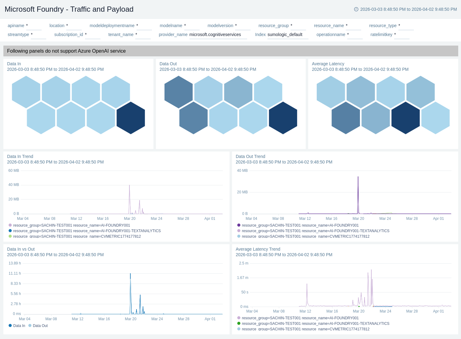 The Microsoft Foundry - Traffic and Payload dashboard provides insights into the data traffic and payload volumes of your Microsoft Foundry service. Panels display information on data in vs out volumes, data ingress and egress trends, average latency, and payload distribution across operations and deployments.