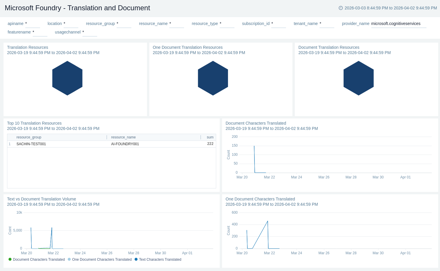 The Microsoft Foundry - Translation and Document dashboard provides insights into text and document translation workloads within your Microsoft Foundry resources. Panels display information on text characters translated, document characters translated, one-document translation volumes, and translation resource utilization across deployments.