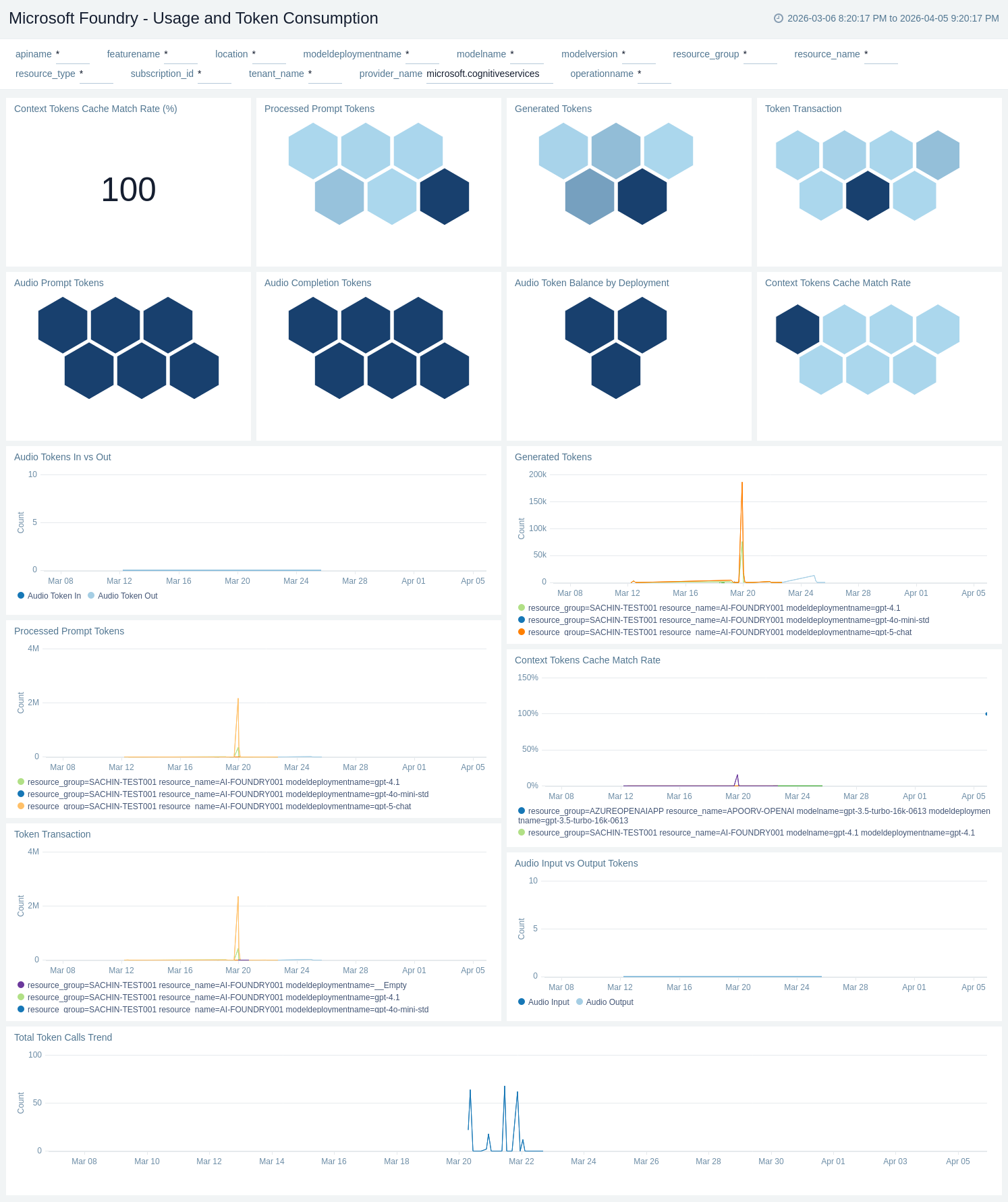 The Microsoft Foundry - Usage and Token Consumption dashboard provides insights into model utilization and token consumption across deployments. Panels display information on prompt tokens (input), generated tokens (output), total tokens processed, cache match rates, and workload trends across different models and regions.