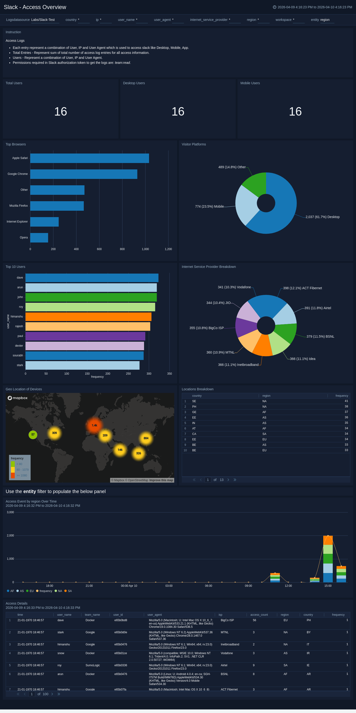 The Slack - Access Overview dashboard analyzes how users connect to Slack—by device, platform, browser, or ISP—and visualizes usage trends and geographic access points.