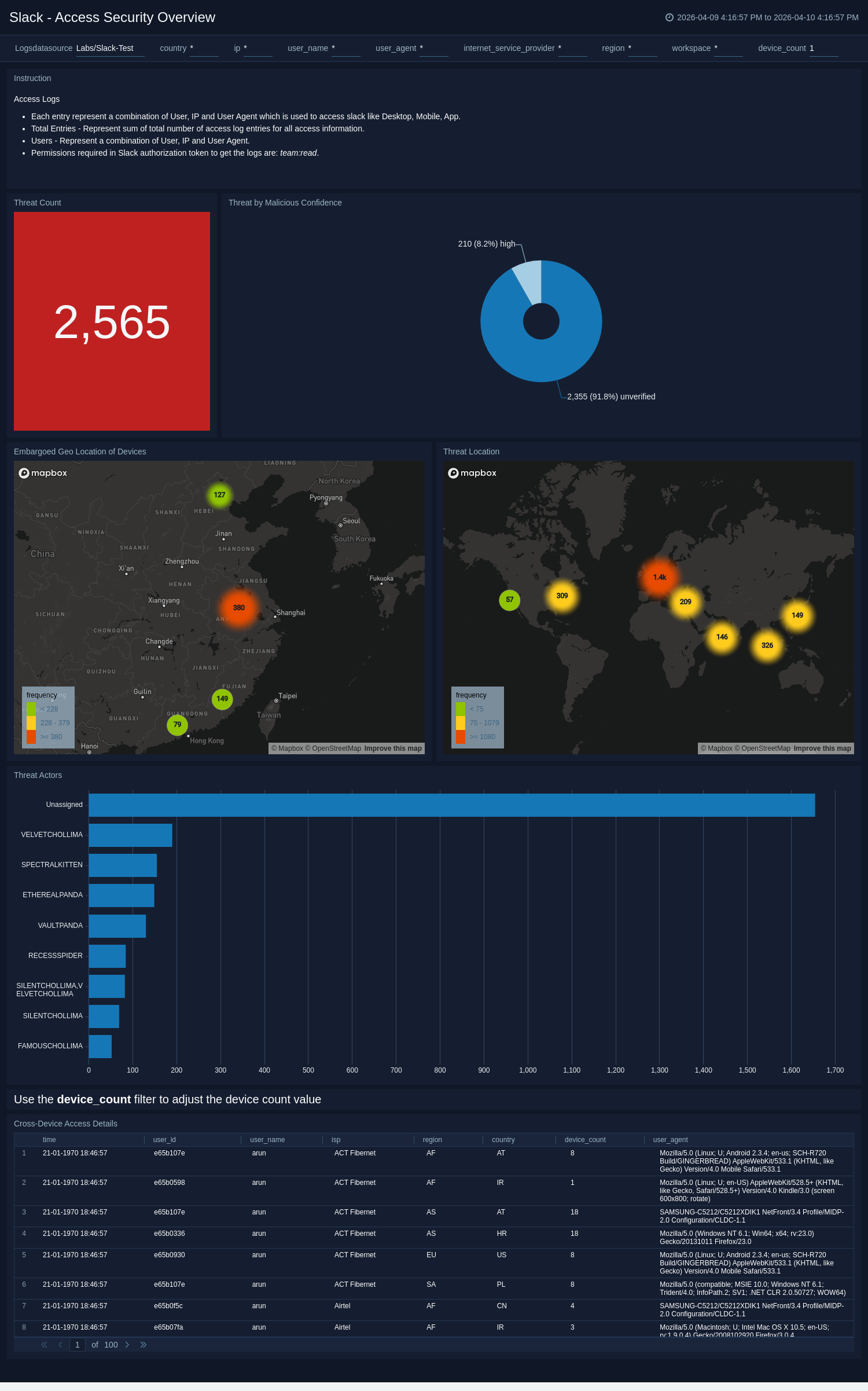 The Slack - Access Security Overview dashboard highlights security threats tied to Slack access. It categorizes threats by actor, location, and confidence level, while tracking suspicious cross-device or embargoed logins.