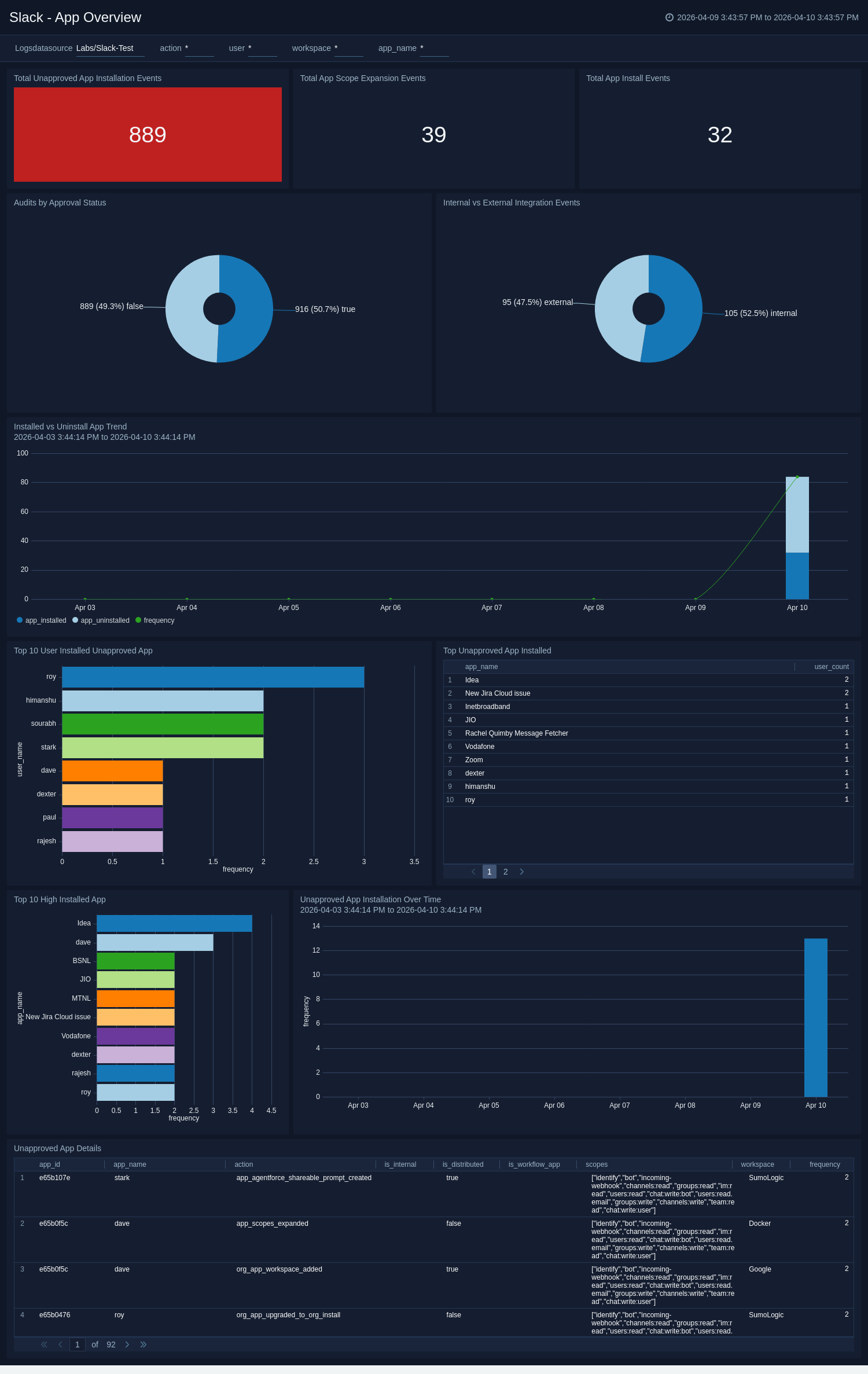 The Slack - App Overview dashboard summarizes application activity across Slack, including installations, uninstalls, scope expansions, and approval statuses. It identifies high-risk or unapproved apps and highlights top-installed and unapproved user apps.