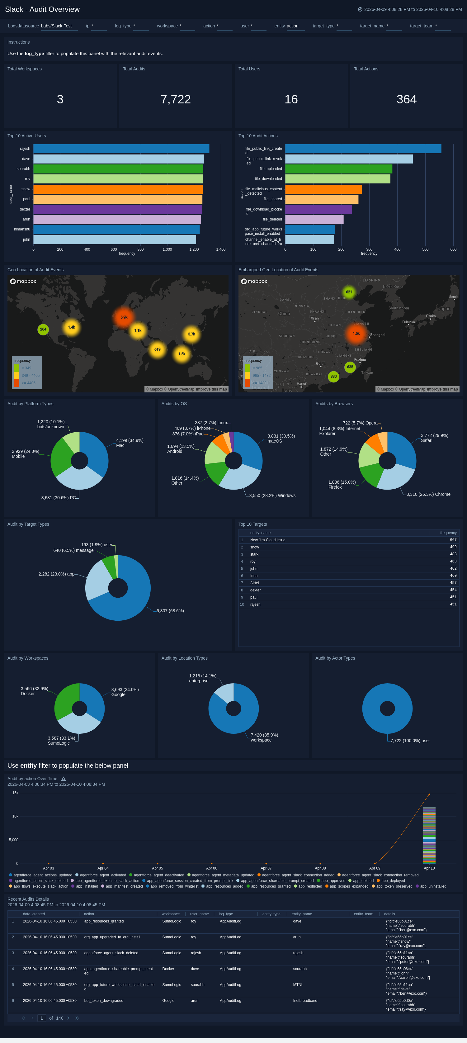 The Slack - Audit Overview dashboard provides visibility into every audited event across devices, browsers, and geographic locations. It details user actions, targets, and actor types to help identify unusual activity or compliance issues.