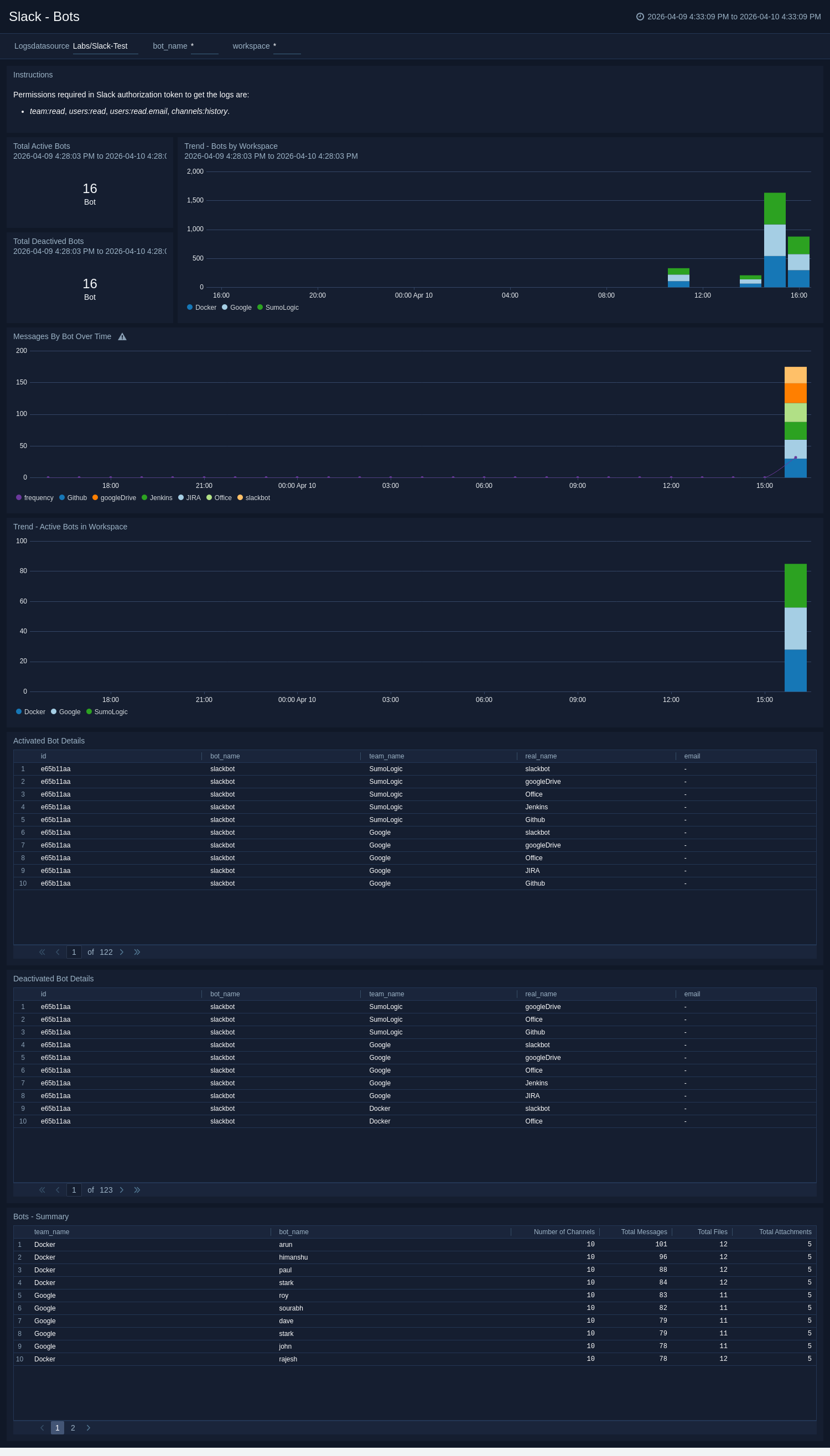 The Slack - Bots dashboard provides visibility into all automated bots within the organization. It tracks activation and deactivation trends, bot message volume, and top active bots by workspace.