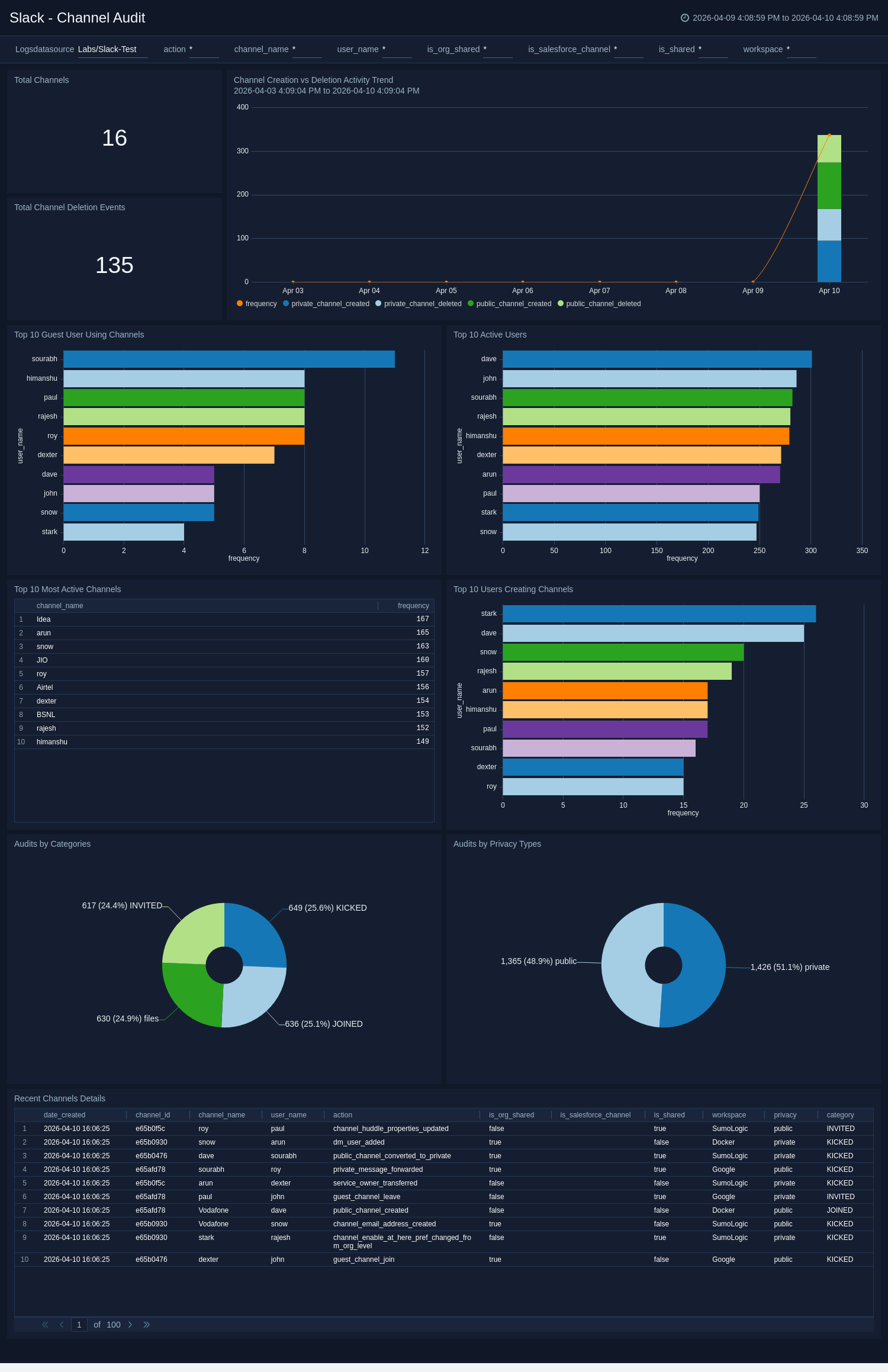 The Slack - Channel Audit dashboard tracks the creation, deletion, and usage of channels, including activity distribution by privacy and category. It identifies the most active channels, creators, and guest participants.
