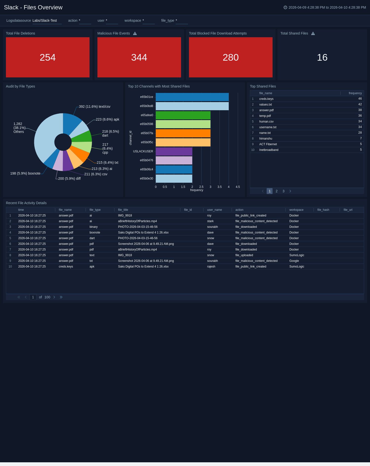 The Slack - Files Overview dashboard monitors file events, including uploads, shares, deletions, and blocked downloads. It also tracks malicious file events and common file types shared across workspaces.