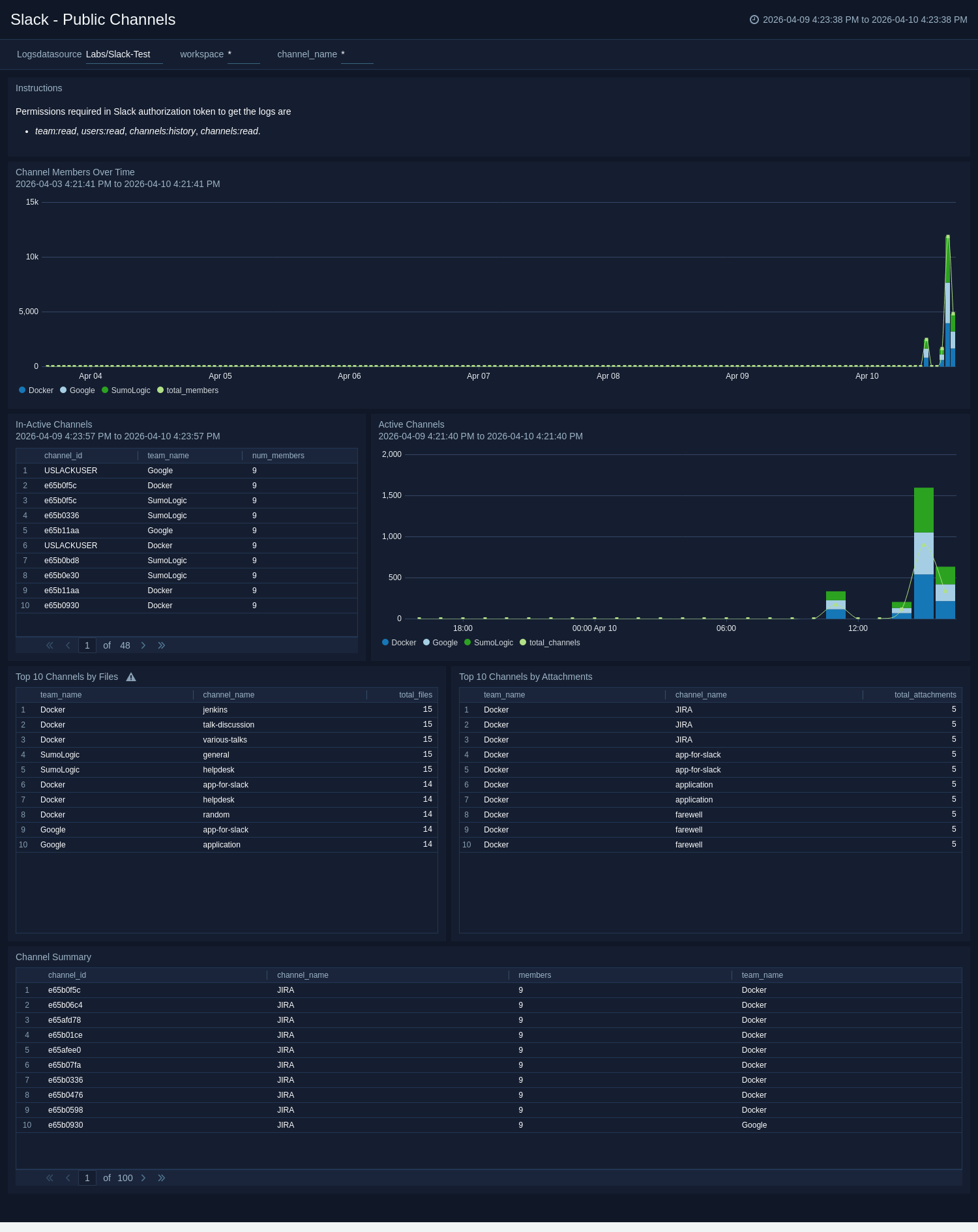 The Slack - Public Channels dashboard tracks engagement and file activity within public channels. It identifies active and inactive channels and highlights those with the most attachments and shared files.