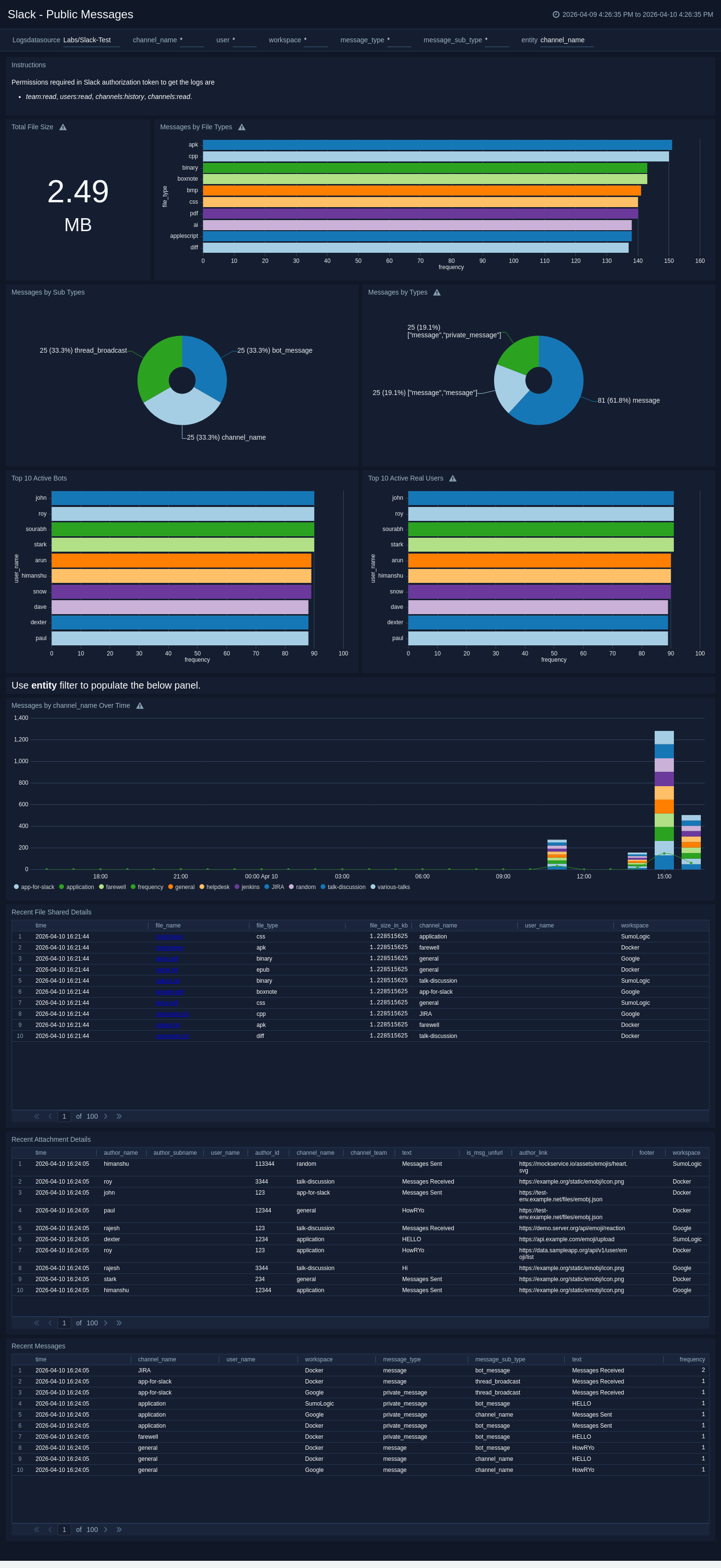 The Slack - Public Messages dashboard provides visibility into message and file-sharing activity within public channels. It includes statistics on message volumes, attachments, and file types, along with detailed message and file metadata.
