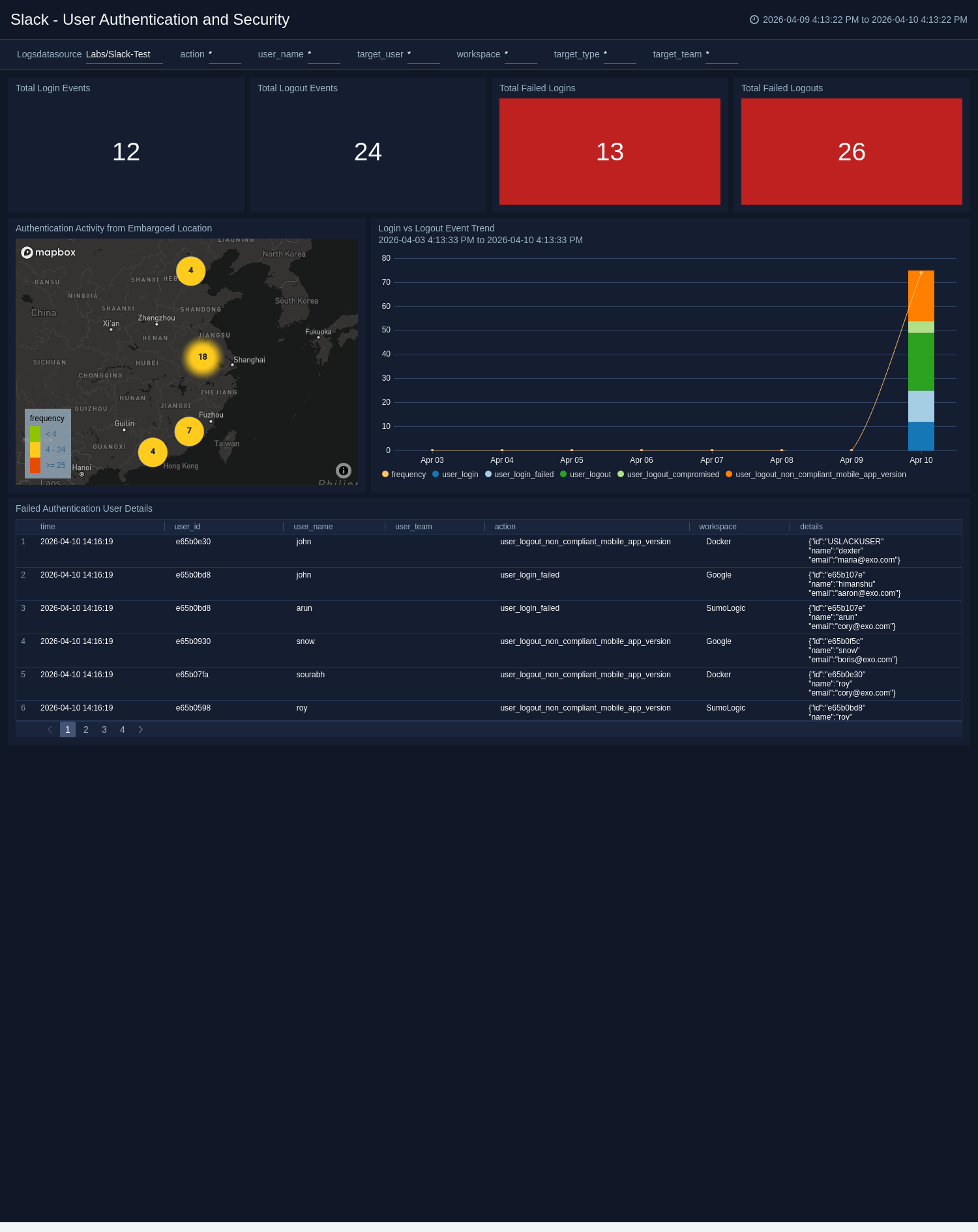 The Slack - User Authentication and Security dashboard displays all login and logout events, including successes and failures. It also tracks SAML configuration changes and access attempts from embargoed regions.