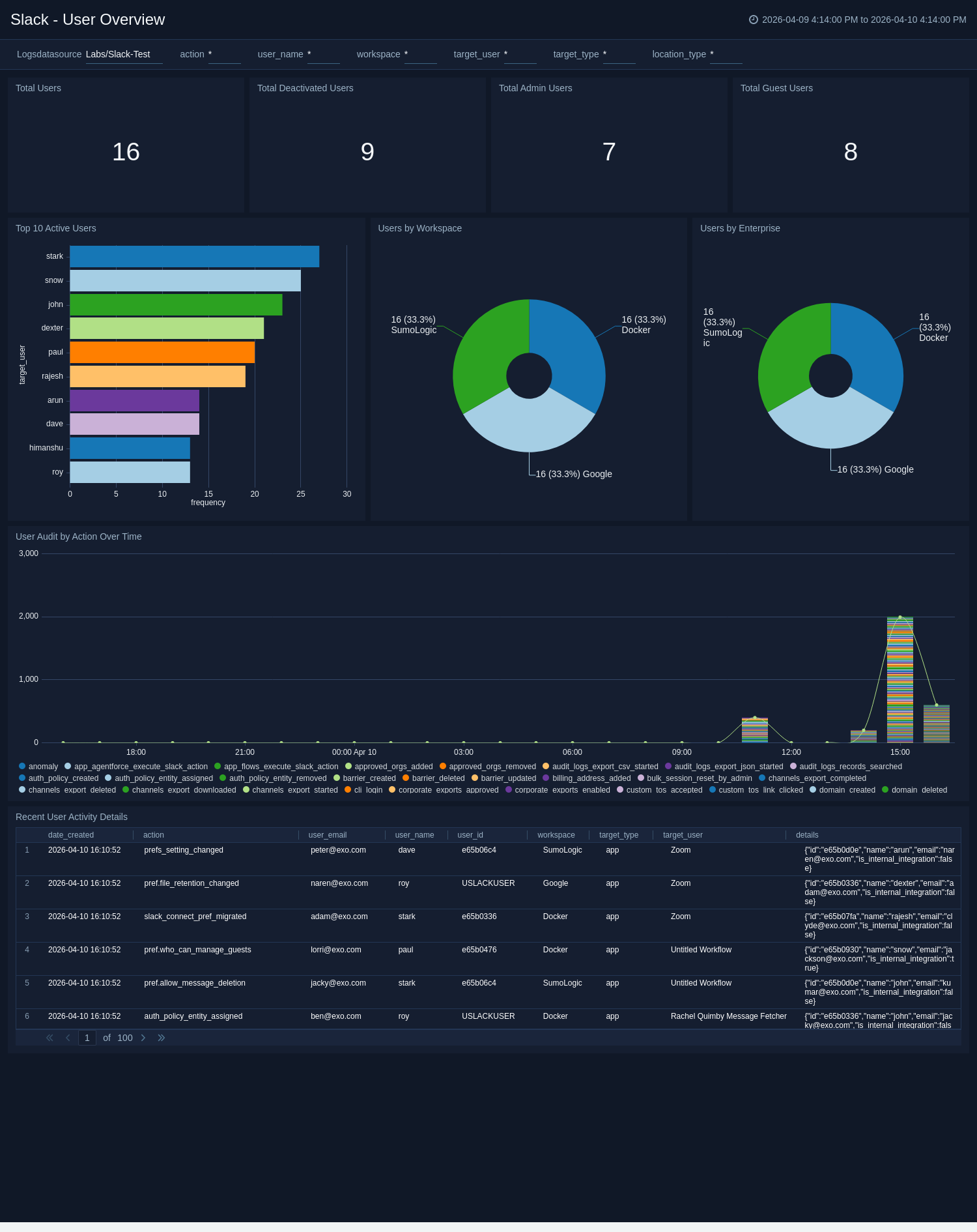 The Slack - User Overview dashboard provides insight into user lifecycles and activity across the environment. It displays counts of total, deactivated, admin, and guest users, and tracks activity by workspace and enterprise.