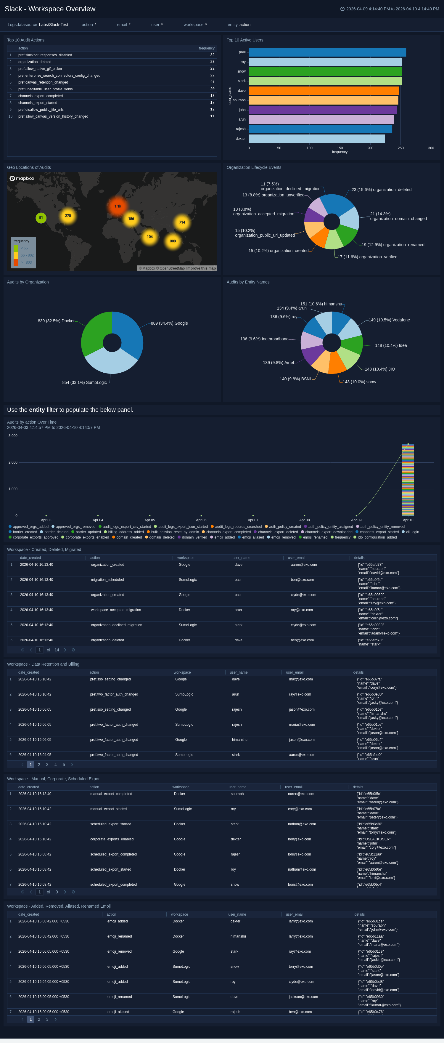The Slack - Workspace Overview dashboard presents key metrics and changes related to workspace lifecycle and configuration. It shows creation, deletion, migration, billing, and retention events as well as geographic audits.