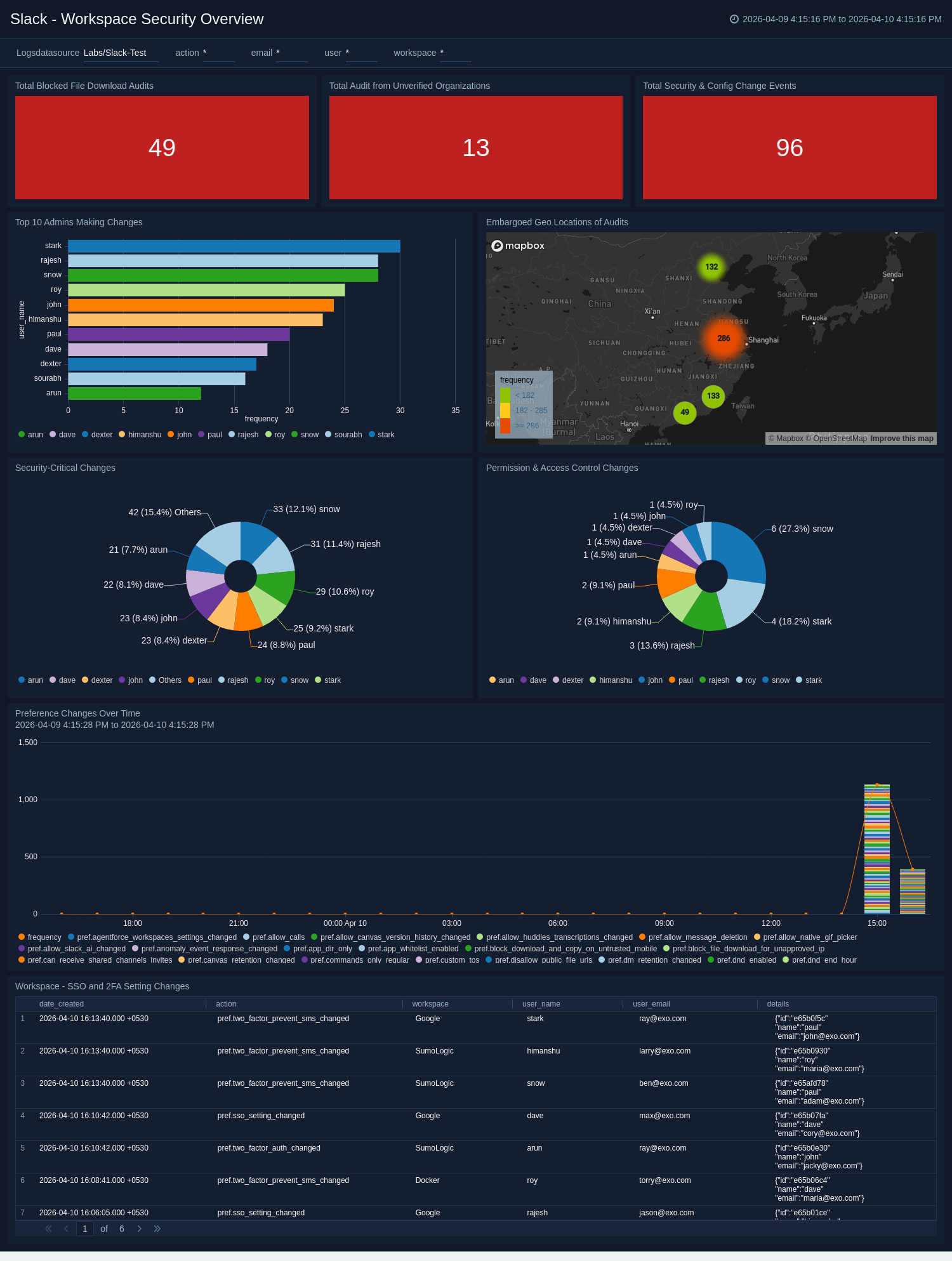 The Slack - Workspace Security Overview dashboard tracks critical workspace-level security activities, including SSO and 2FA setting changes, embargoed access locations, and permission updates.