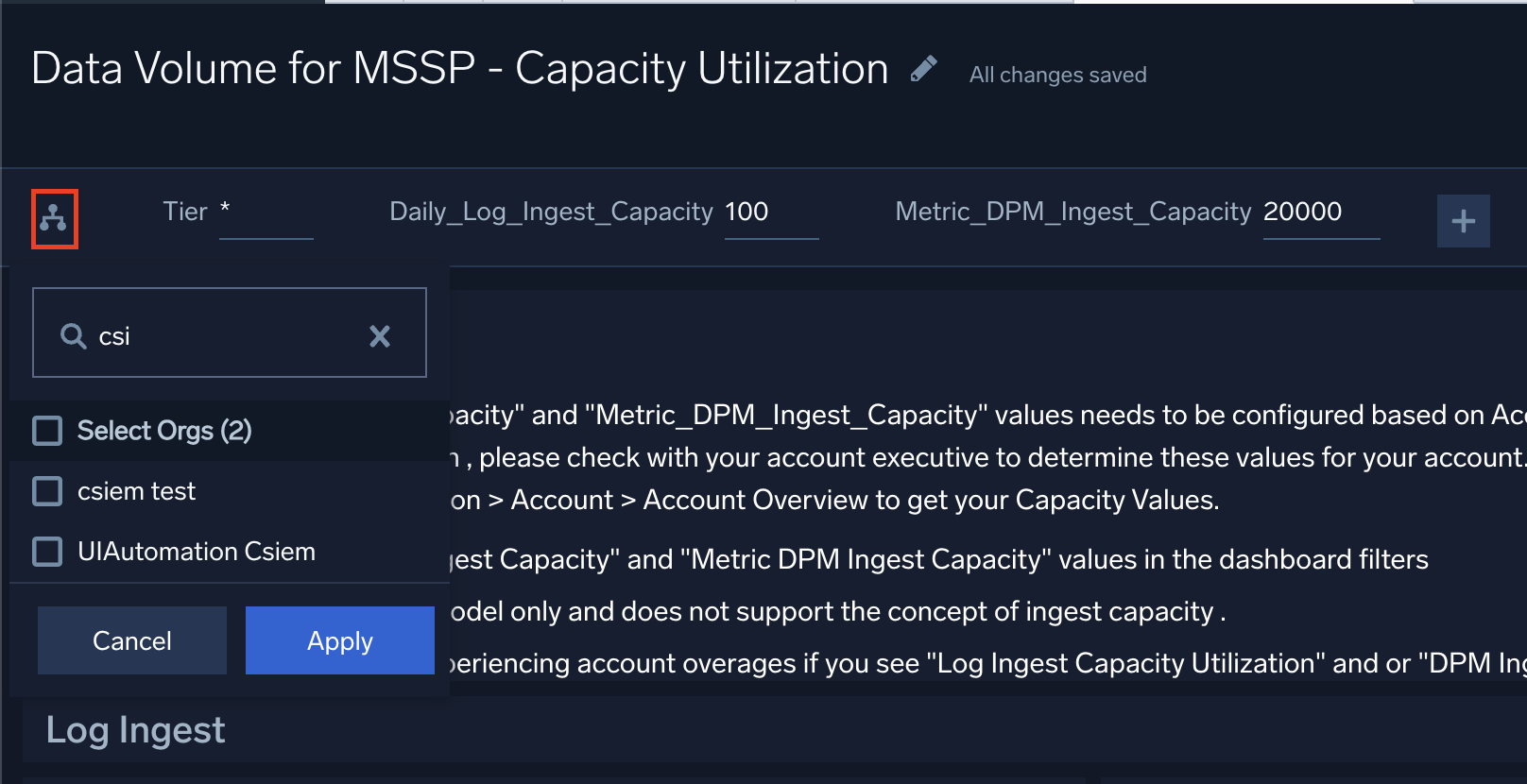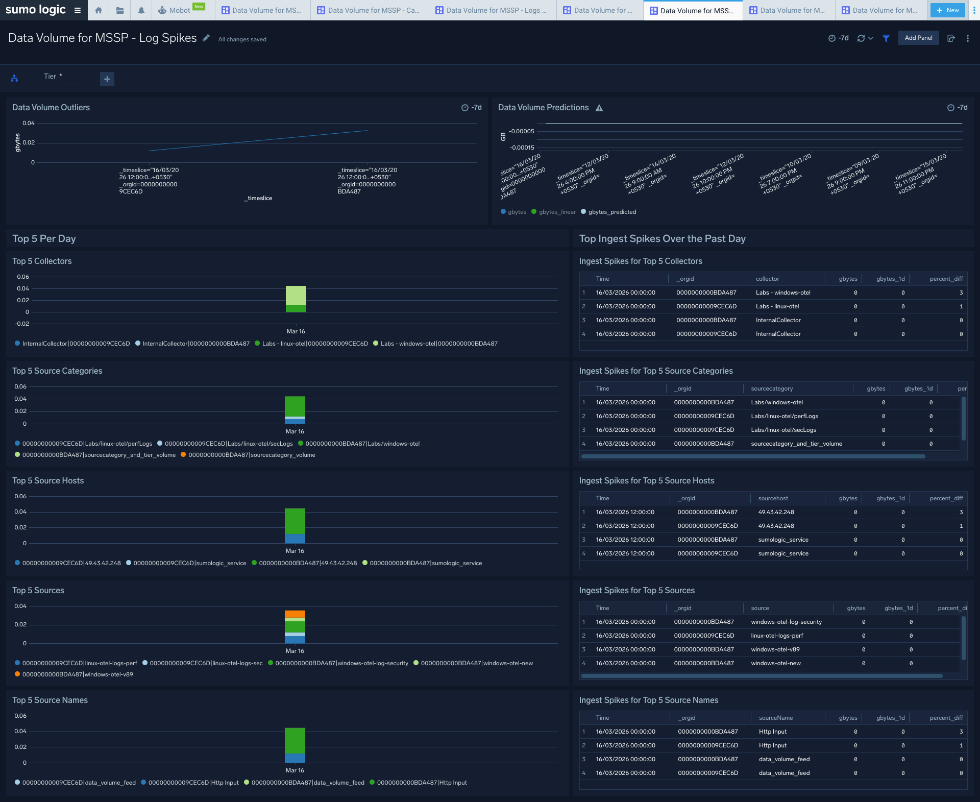 The largest data ingest typically comes from log volumes. The Data Volume for MSSP - Logs dashboard allows you to view child org log ingest volume by tier by ingesting spikes, outliers, and quota.